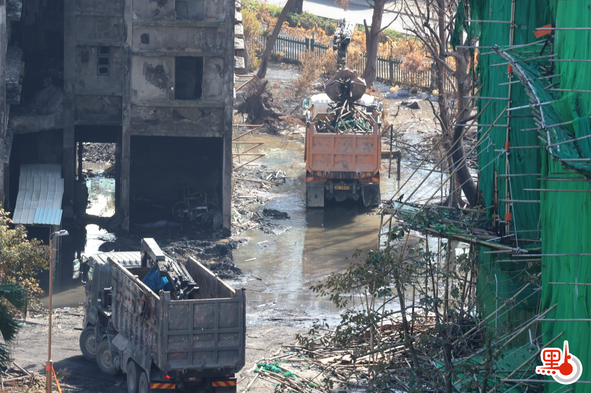 大公文匯全媒體報道,大埔宏福苑發生五級火,造成嚴重傷亡,有關部門今日(11日)繼續在災場進行搜索、勘察及清理工作。記者現場所見,有吊臂車換上夾斗把棚架竹枝等雜物搬上車斗;警方災難遇害者辨認組(DVIU)人員則繼續在燒毀的瓦礫及雜物中進行搜索,仔細逐一檢查是否有遺骸或骸骨。