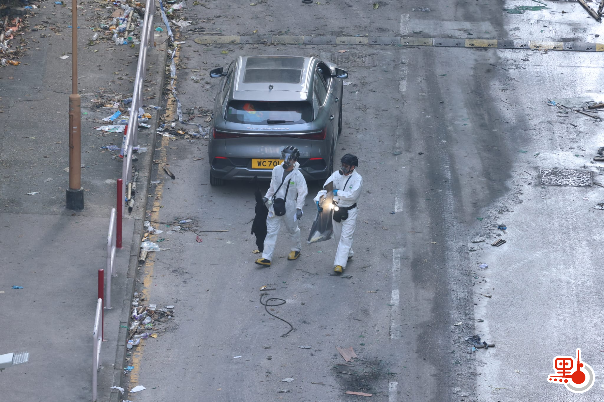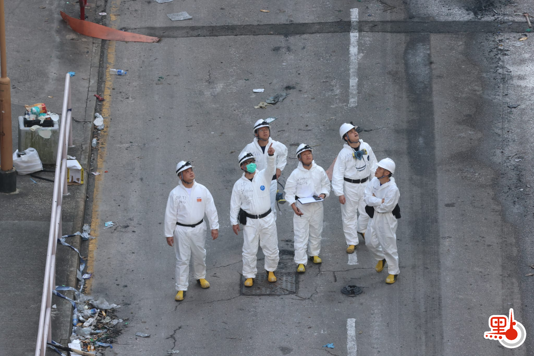 房屋署人員亦到場在樓宇外圍進行勘察工作,房屋署與警方協調後,將於明日(12日)開始移除宏昌閣、宏泰閣及宏新閣被燒毀的外牆棚架。