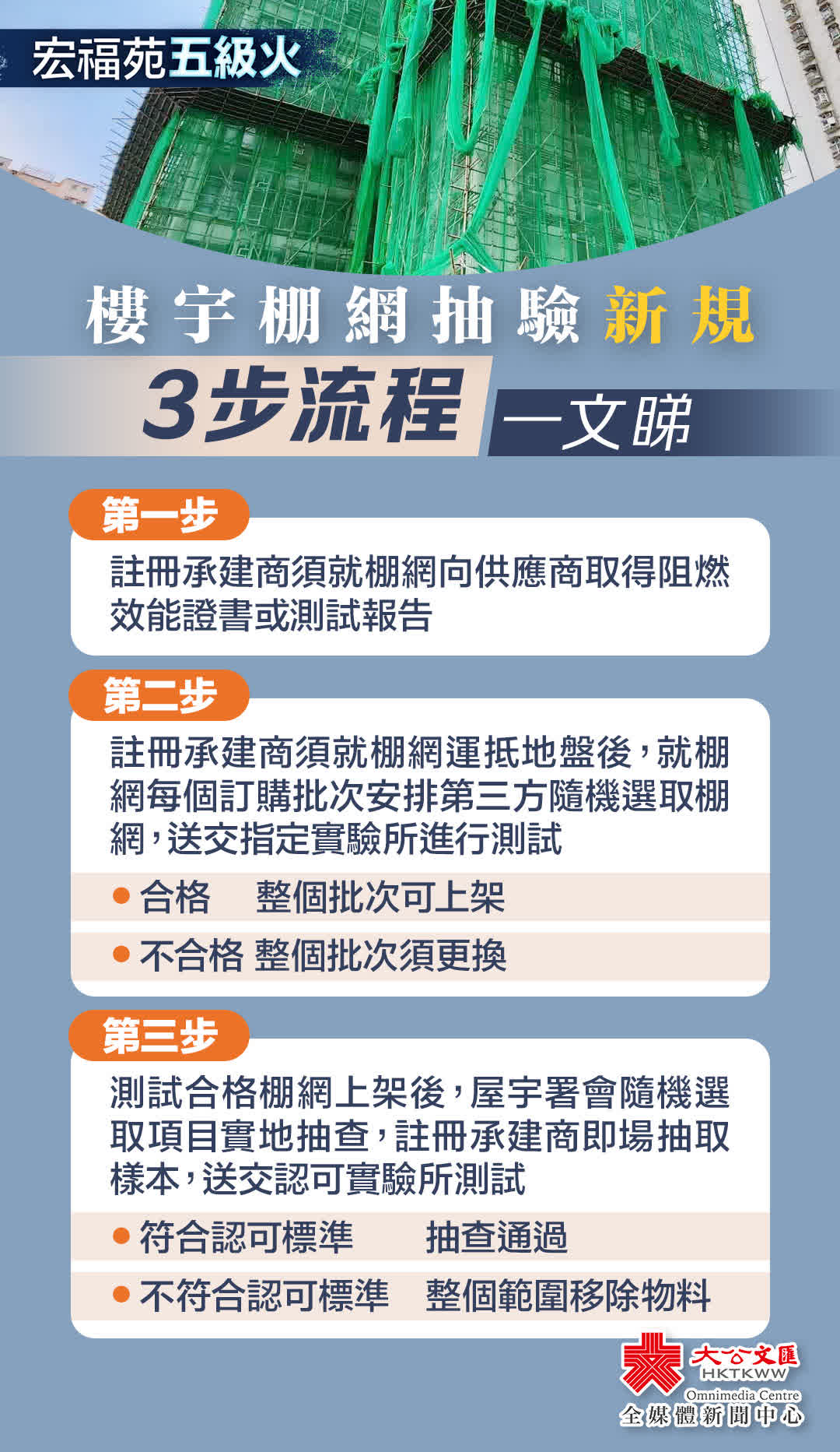大公文匯全媒體報道,大埔宏福苑11月26日發生奪命的五級大火,釀成過百人遇難,數千人失去家園。發展局局長甯漢豪今日(11日)宣布,樓宇抽驗棚網會有3個環節,包括承建商需向政府提供棚網阻燃效能證明書;必須按政府的要求,以既定的方式抽取指定數目的樣本,並送至政府指定的化驗所進行化驗,通過檢查後才能上架使用;棚網上架之後,政府部門會進行隨機抽樣,抽樣結果須符合標準。