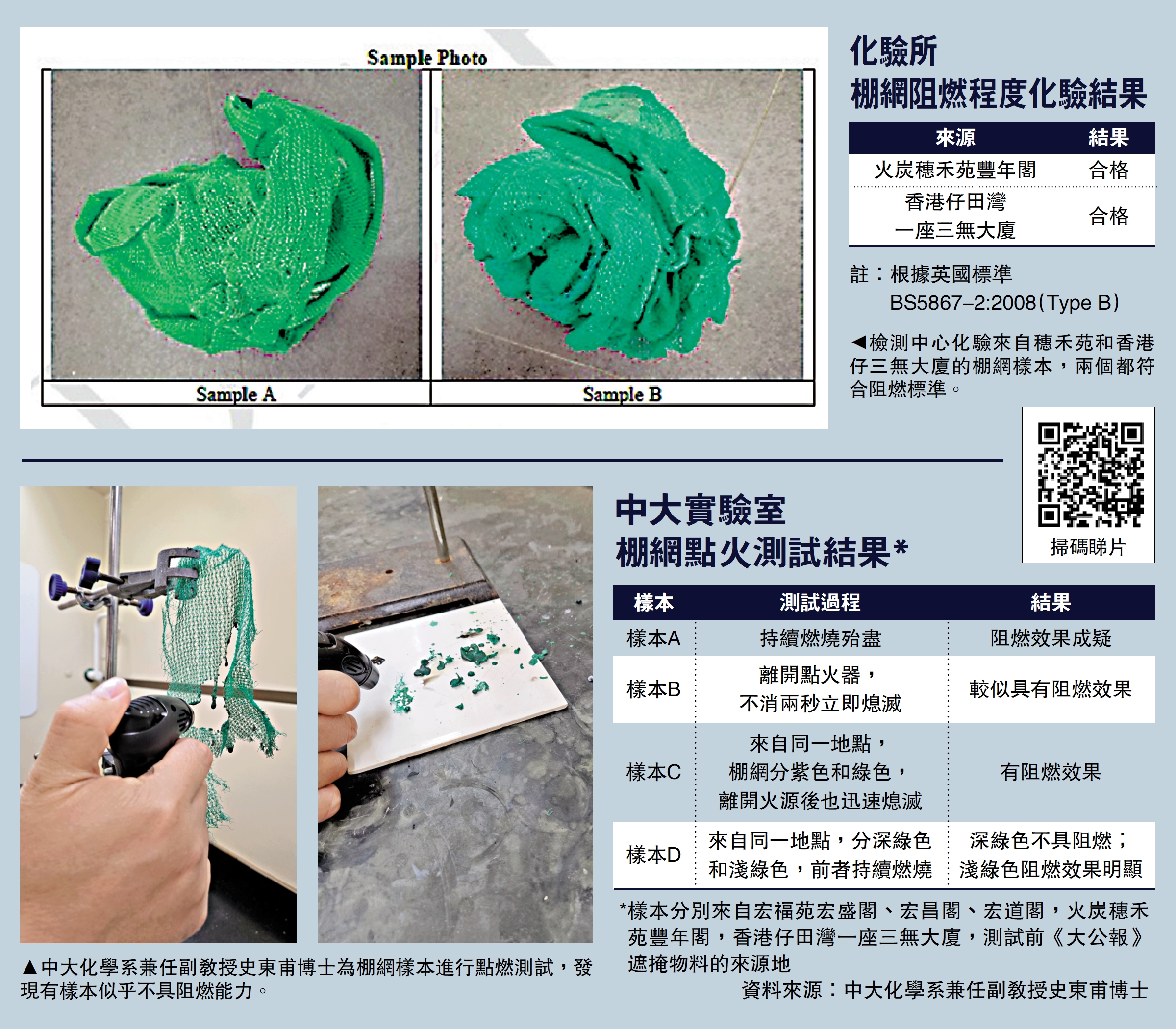近日有棚網檢測報告被揭發造假,《大公報》早前從不同屋苑住戶取得五份棚網樣本,當中三份來自宏福苑宏盛閣、宏昌閣、宏道閣,一份來自火炭穗禾苑豐年閣,一份來自香港仔田灣一座三無大廈,《大公報》日前將多份棚網樣本,交予香港中文大學化學系兼任副教授史東甫博士,進行點火測試了解阻燃效果,史博士在測試前強調,基於有關測試的樣本數量未達一份正式化驗報告的要求,所以只可以進行簡單的點火測試,從物料燃燒時的效果,作出初步評論以供參考。