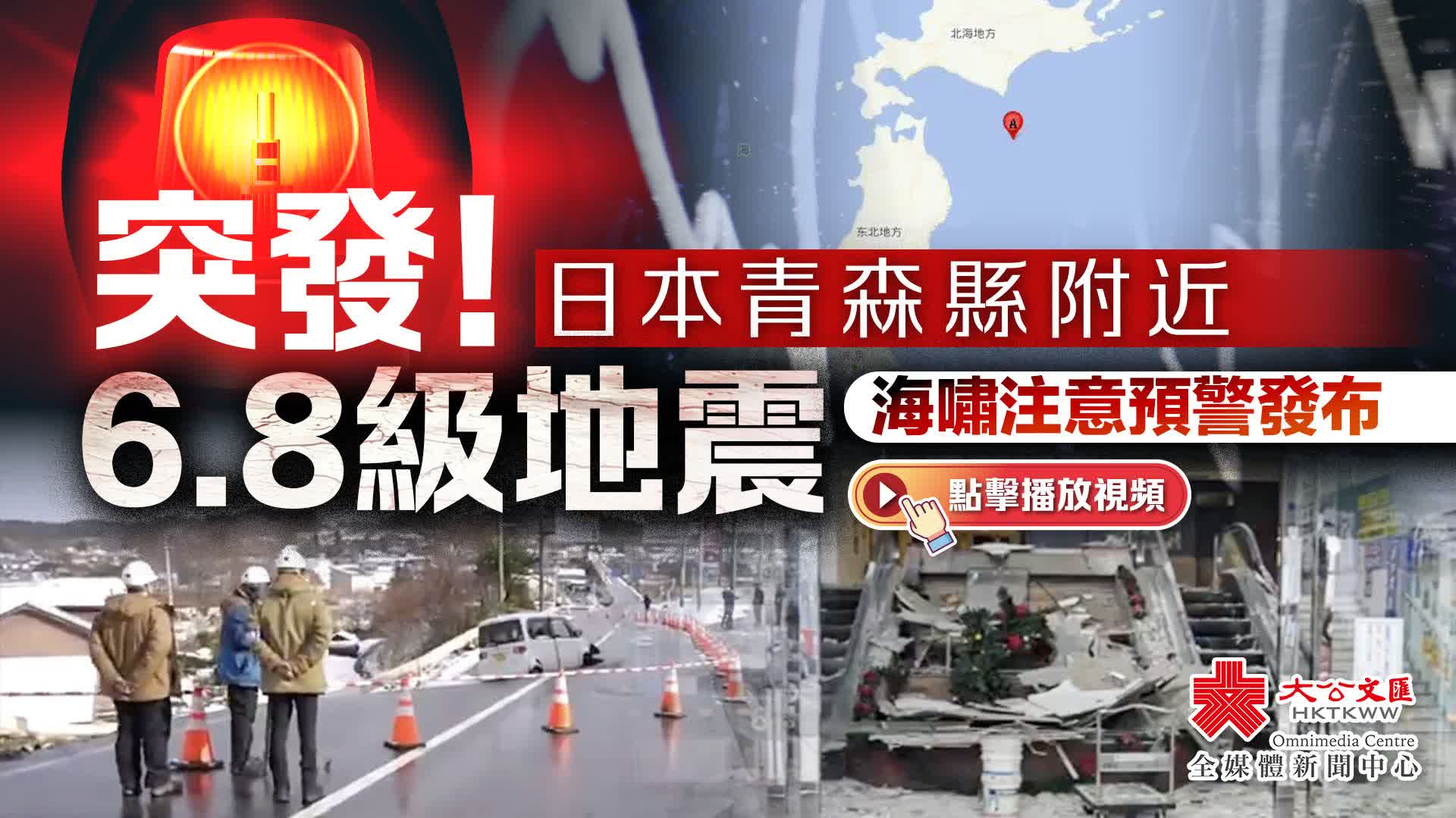 大公文匯全媒體報道,日本政府12日發布緊急地震預警,日本青森縣附近發生地震。中國地震台網正式測定,12月12日10時44分在日本本州東部附近海域(北緯40.85度,東經142.95度)發生6.8級地震,震源深度20千米。