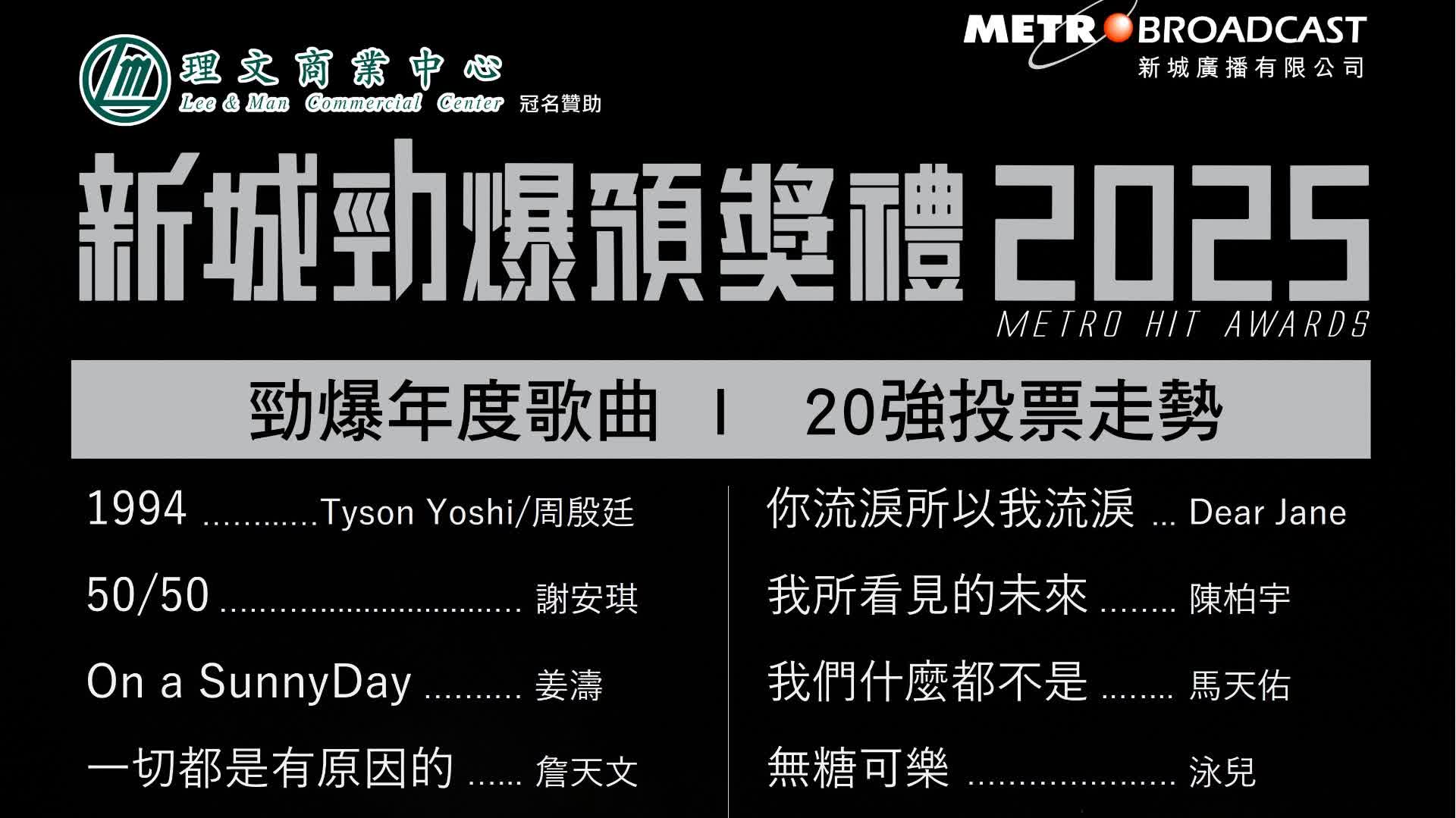 (大公文匯全媒體 特約記者 陳惠芳)《新城勁爆頒獎禮2025》將於本月27日假香港會展中心舉行。隨着公眾投票進入白熱化階段,大會昨日(11日)下午6時公布「勁爆年度歌曲」二十強最新投票走勢。