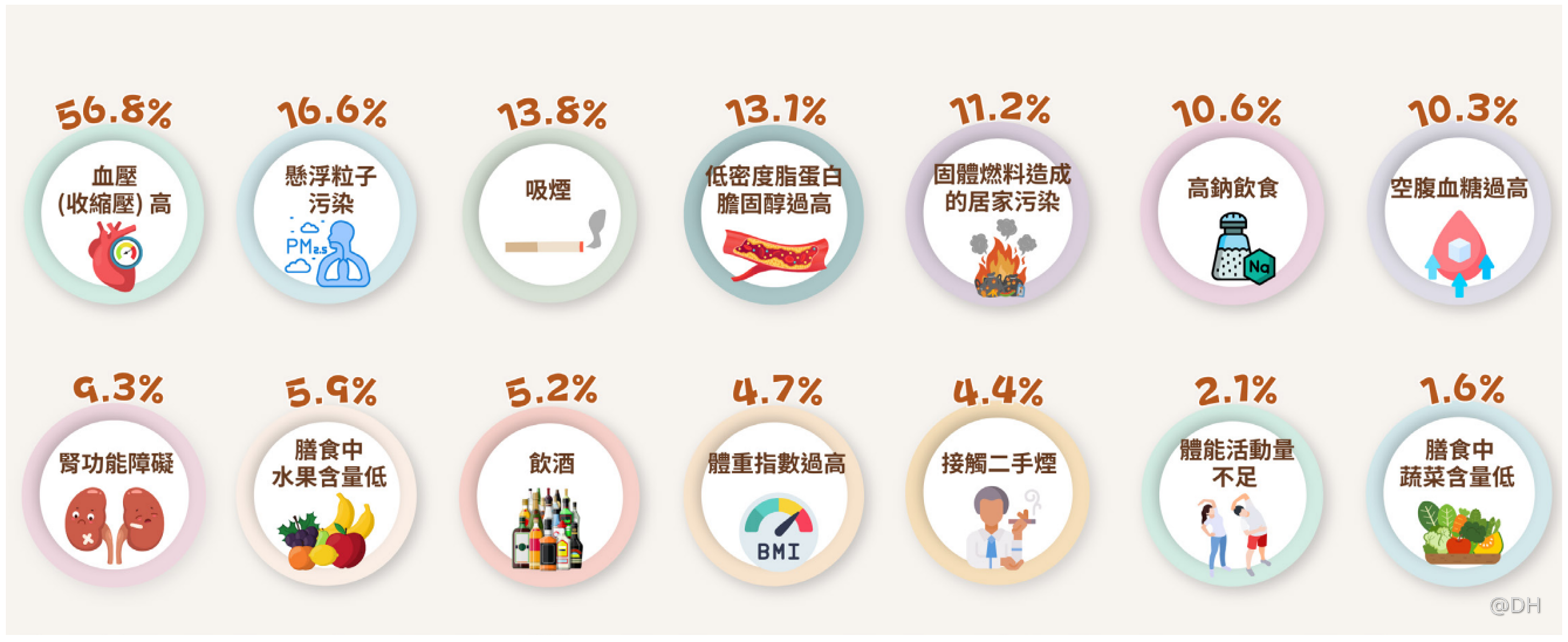 2021年全球疾病負擔研究指出,全球 84% 的中風負擔可歸因於 23 個涉及代謝、生理、飲食、行為及環境等可改變的風險因素,,而當中14 個被認定為中風的重要風險因素。