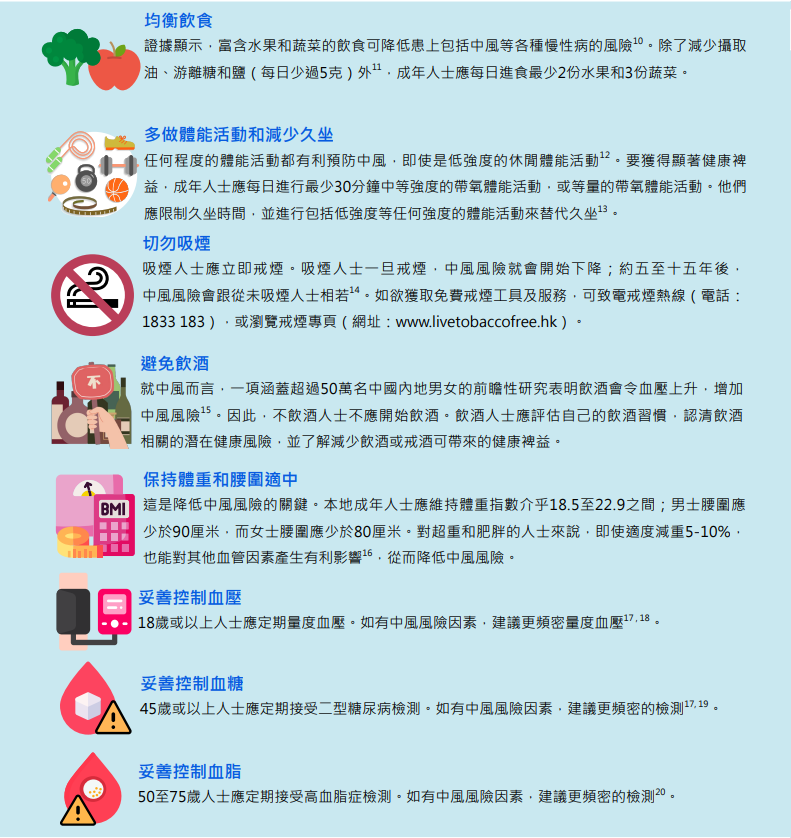 好消息是,透過奉行健康生活模式以及妥善管理高血壓、高膽固醇、糖尿病和肥胖等風險因素,研究指多達八成的中風案例是可以預防的 。