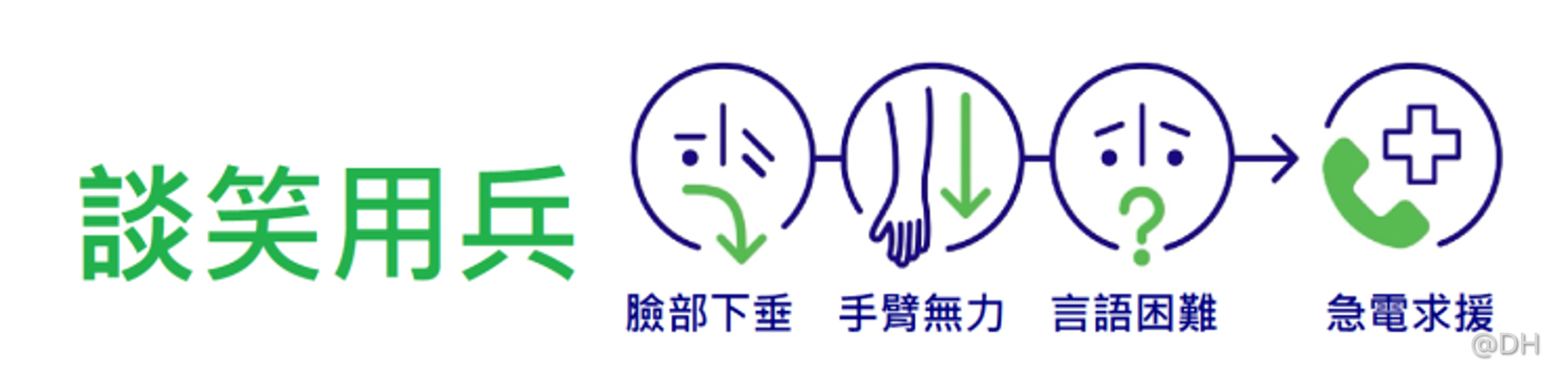 中風可在沒有任何預兆的情況下發生,識別中風徵兆對治療至關重要。謹記以下「談笑用兵」口訣: