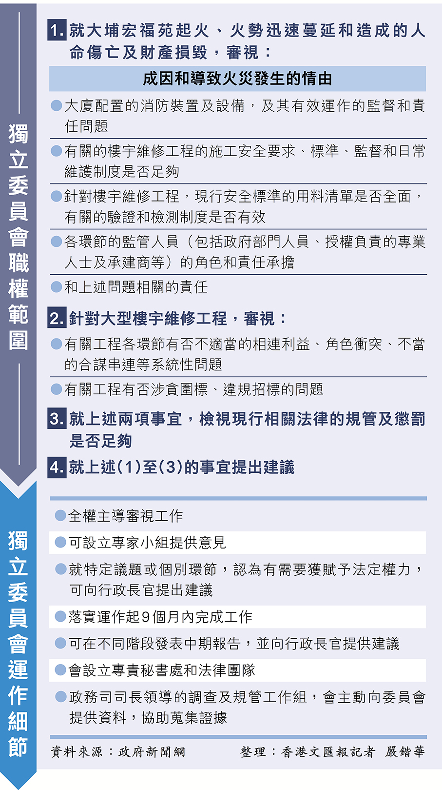 (香港文匯報 記者 嚴鍇華)因應大埔宏福苑大火事件,香港特區行政長官李家超昨日宣布委任高等法院原訟法庭法官陸啟康出任獨立委員會主席,並委任行政會議成員陳健波和港鐵董事局非執行主席歐陽伯權出任委員。委員會須於9個月內完成報告,職權範圍包括針對大埔宏福苑起火、火勢迅速蔓延及火災造成的人命傷亡及財產損毀以及大型樓宇維修工程進行審視工作,並檢視現行相關法律的規管及懲罰是否足夠,及提出建議。李家超表示,會考慮給予獨立委員會備用權力,讓獨立委員會就特定議題或個別環節成為法定調查委員會,就該指定事宜行使法定權力,政府並已成立由政務司司長領導的調查及規管工作組,全力支持獨立委員會的工作。他形容,獨立委員會是以先驅性、創新性且獨立的方式處理一個複雜、廣泛的系統性問題,政府會全力支持獨立委員會的工作。