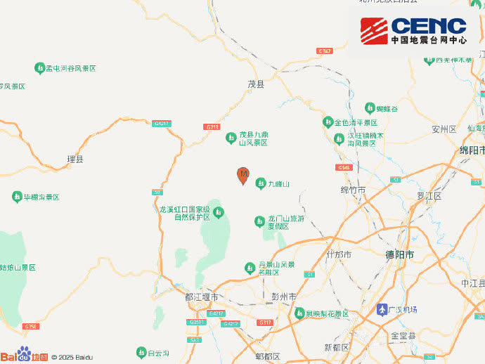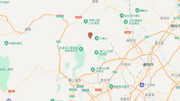 震中距汶川縣24公里、距茂縣35公里、距綿竹市39公里、距什邡市43公里、距彭州市45公里,距德陽市62公里,距成都市84公里。