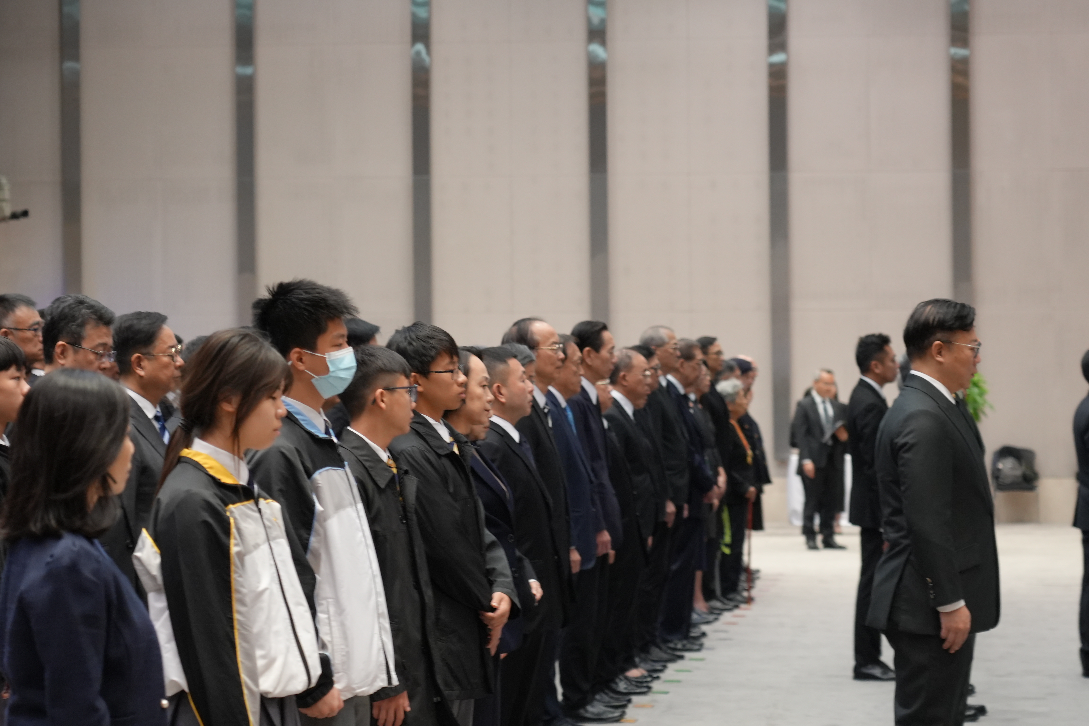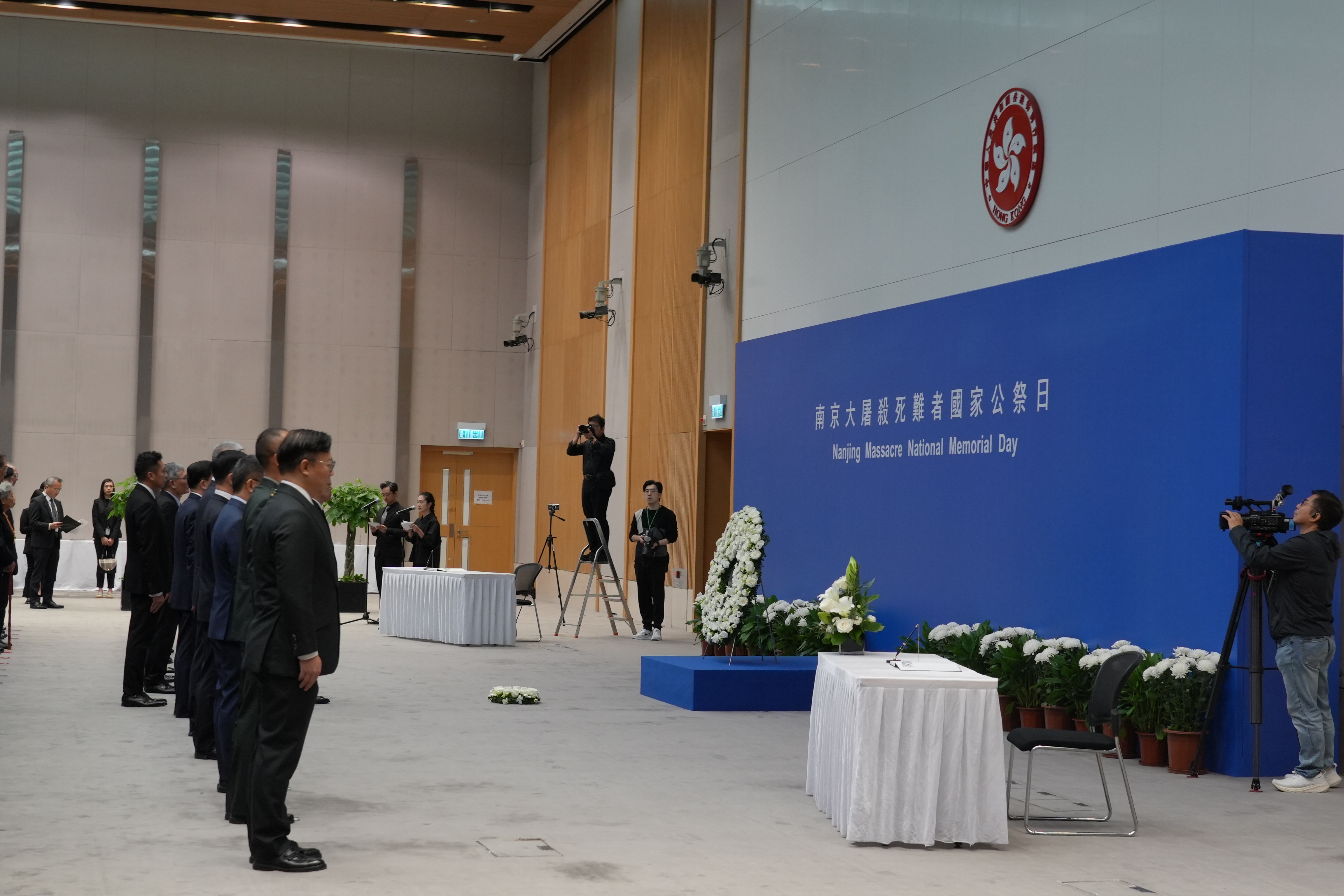 (大公文匯全媒體 記者 劉妍伶)今日(13日)是南京大屠殺死難者國家公祭日,特區政府舉行「南京大屠殺死難者國家公祭日」儀式。行政長官李家超、中央人民政府駐港機構代表、特區政府主要官員、司法機構代表、原東江縱隊港九獨立大隊老游擊戰士、退伍軍人代表及學生代表等出席儀式。