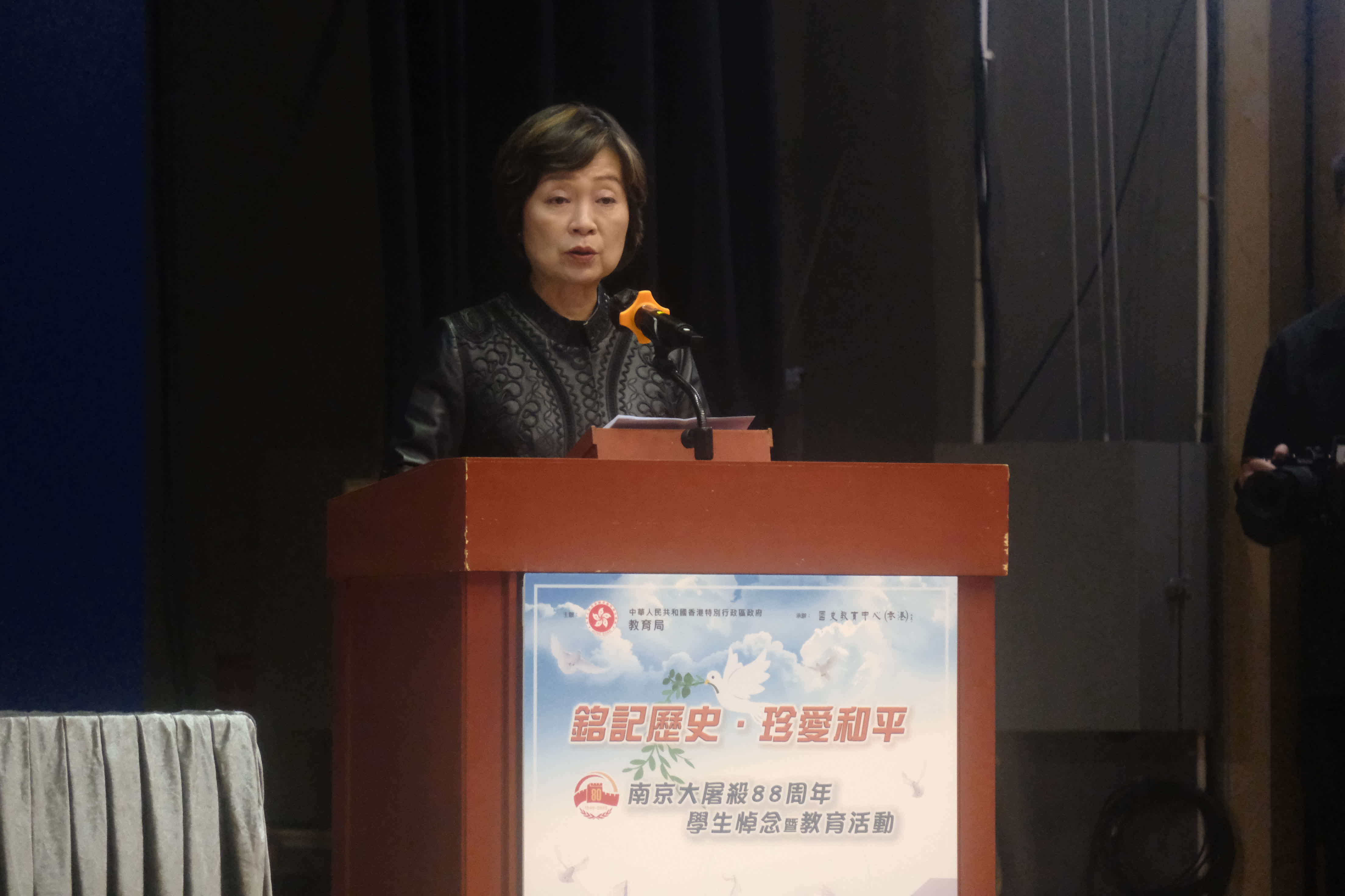 教育局局長蔡若蓮在致辭時表示,「銘記歷史是為了從中汲取教訓,歷史用最慘烈的方式告訴我們,有國才有家,國強才能民安。國家貧弱,人民蒙難,尊嚴無存。」她鼓勵青年奮發圖強,將個人理想追求融入國家發展、民族復興的偉業,用知識才幹築起維護國家主權、安全及發展利益的長城。