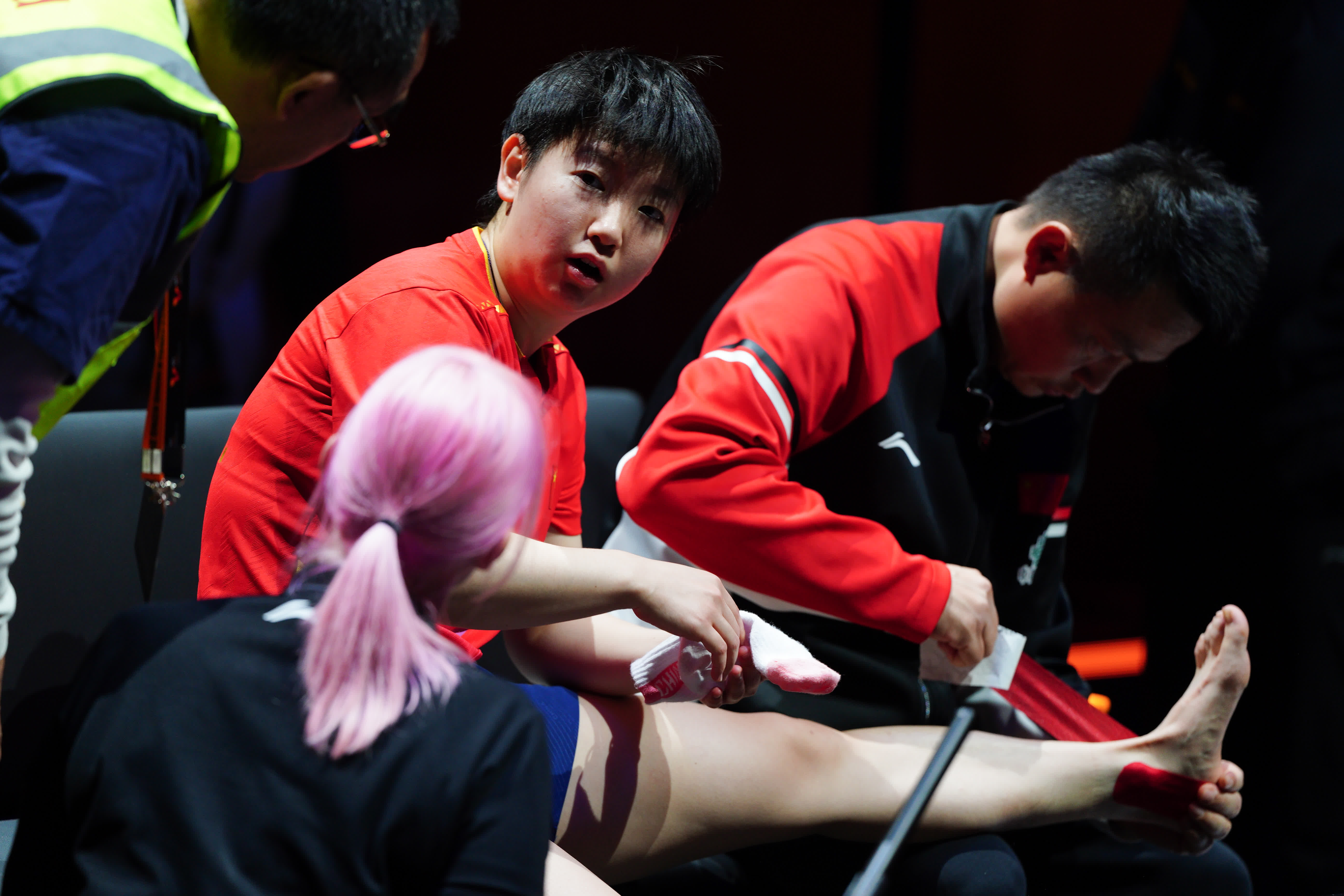 女單半決賽第三局結束後,孫穎莎叫了醫療暫停,隨後,孫穎莎纏上了繃帶,堅持比賽。比賽進行到第五局末,孫穎莎因腳傷退出比賽,蒯曼由此晉級女單決賽。