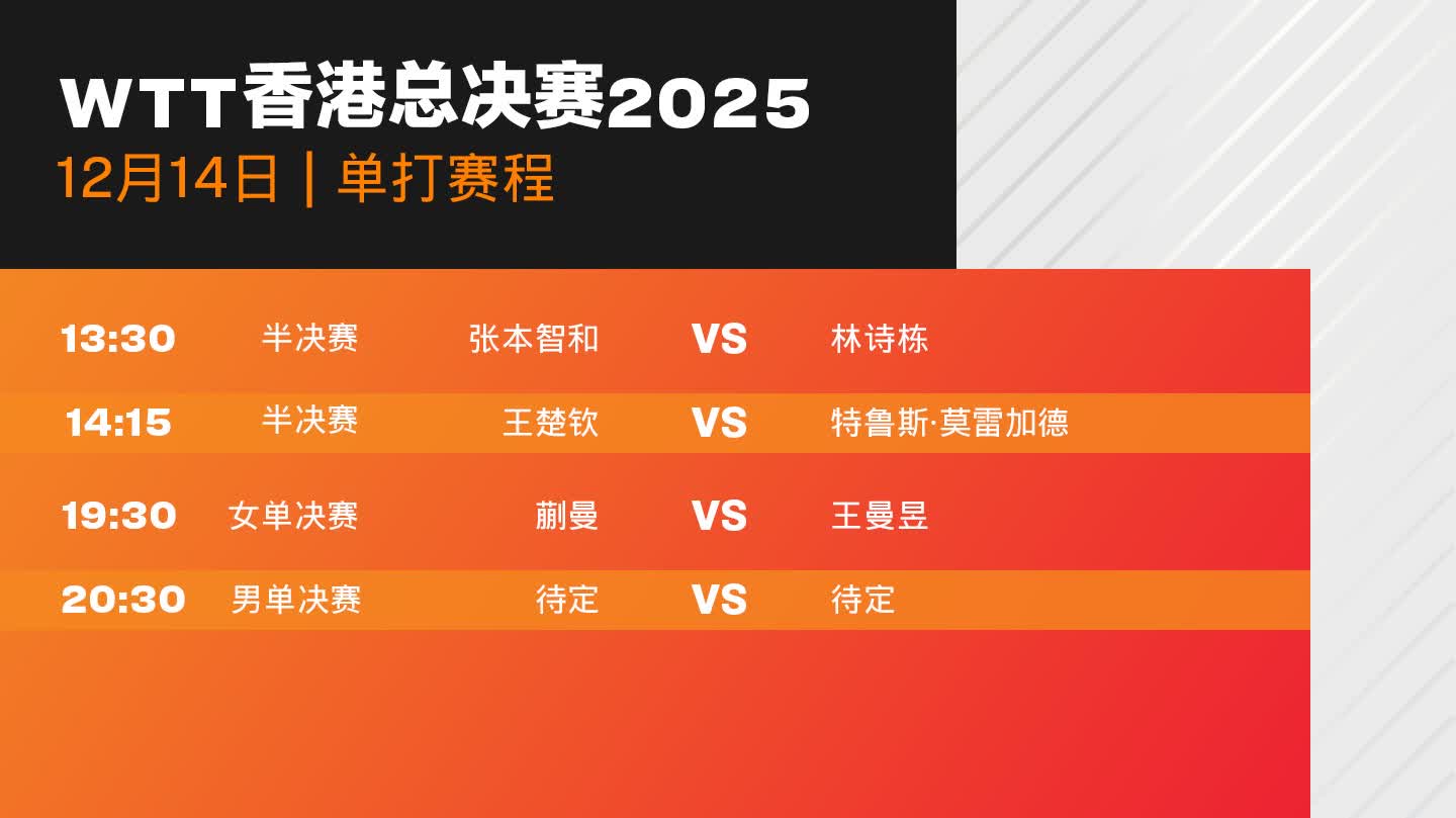 大公文匯全媒體報道,WTT香港總決賽2025今晚(14日)將迎來收官之戰。今晚7時30分,蒯曼與王曼昱將角逐女單冠軍,國乒提前包攬金牌與銀牌。而男單半決賽方面,林詩棟將於下午1時30分率先對戰張本智和,王楚欽將於下午2時15分迎戰特魯斯·莫雷加德,勝者將晉級今晚8時30分舉辦的男單決賽,爭奪冠軍。具體賽程如下: