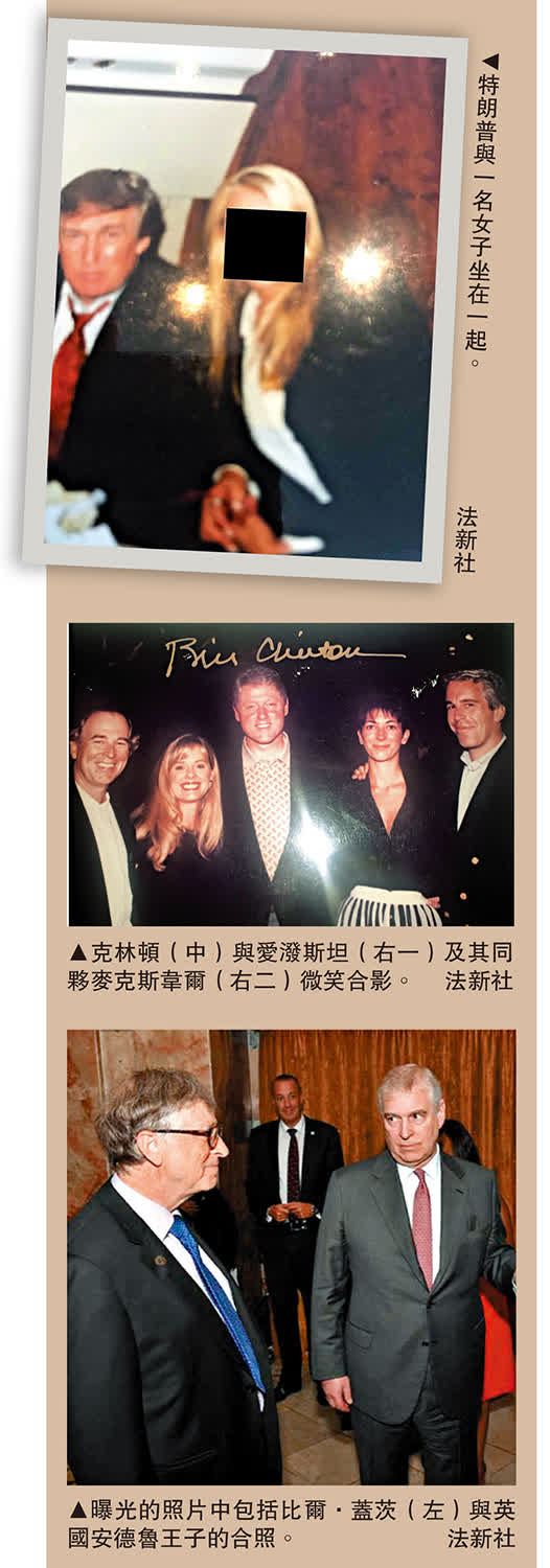 大公報綜合報道,當地時間12日,美國國會眾議院民主黨人公布涉及已故富豪淫媒愛潑斯坦的一批新照片。出現在這些照片中的政商名流包括:美國現任總統特朗普、民主黨籍前總統克林頓、微軟聯合創始人比爾·蓋茨、在特朗普第一任期擔任白宮首席策略師的班農,還有前美國財政部長和哈佛校長的薩默斯等人。路透社日前公布的最新民調顯示,70%的受訪者認為特朗普政府有意隱瞞涉愛潑斯坦案的人員信息,其中包括62%的共和黨人。