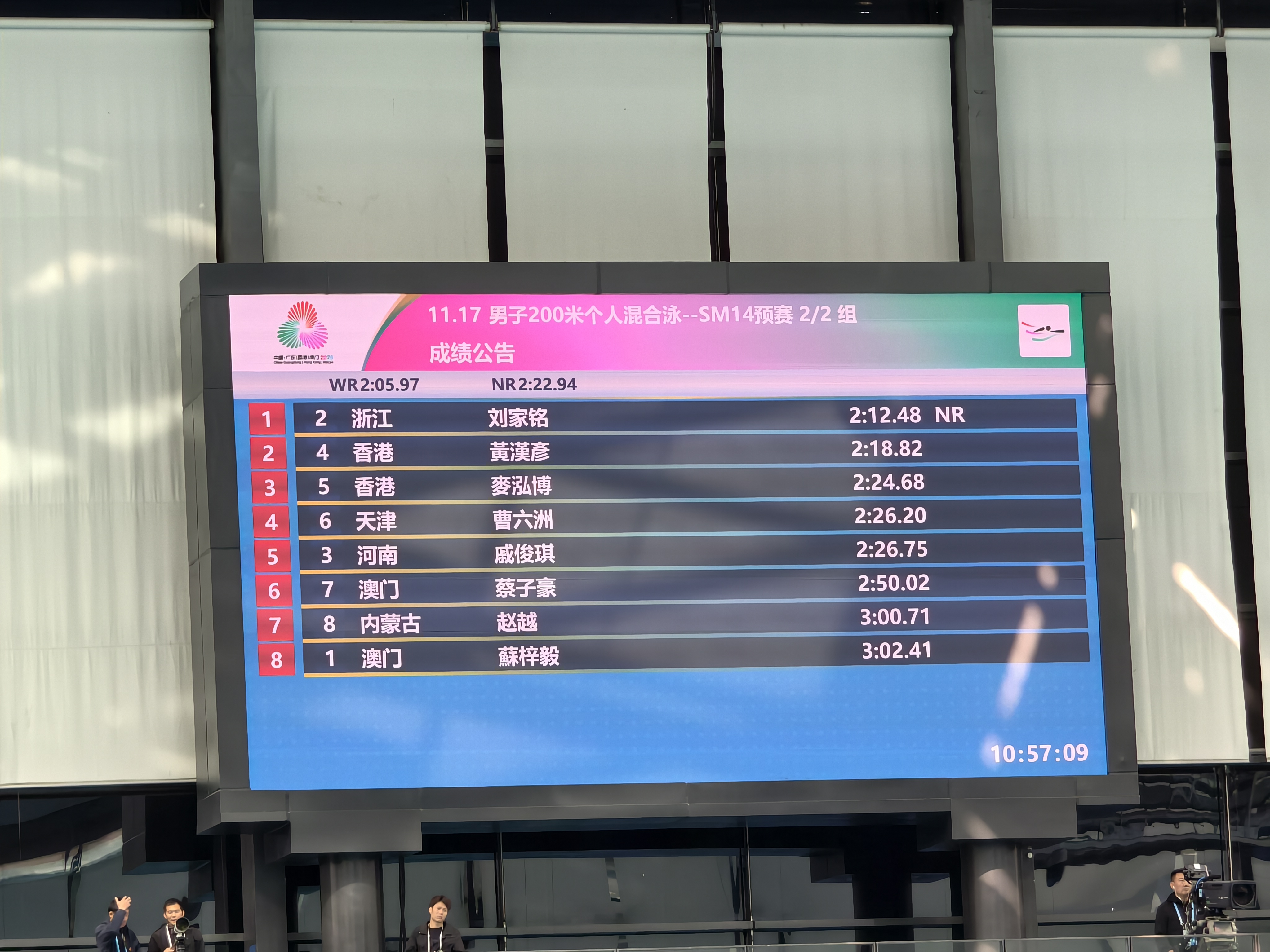 (大公文匯網 記者 胡永愛、李薇、石華)12月14日,殘特奧會游泳項目進入收官日,在上午舉行的200米混合泳SM14級決賽中,港隊三人進入晚上決賽。小組第一組比賽中,洪泳朗以2分23秒15的成績排在小組第一。小組第二組,黃漢彥游出2分18秒82的好成績,排名在浙江隊劉家銘之後、取得小組第二,破全國紀錄。麥泓博則以2分24秒68的成績排在小組第三。