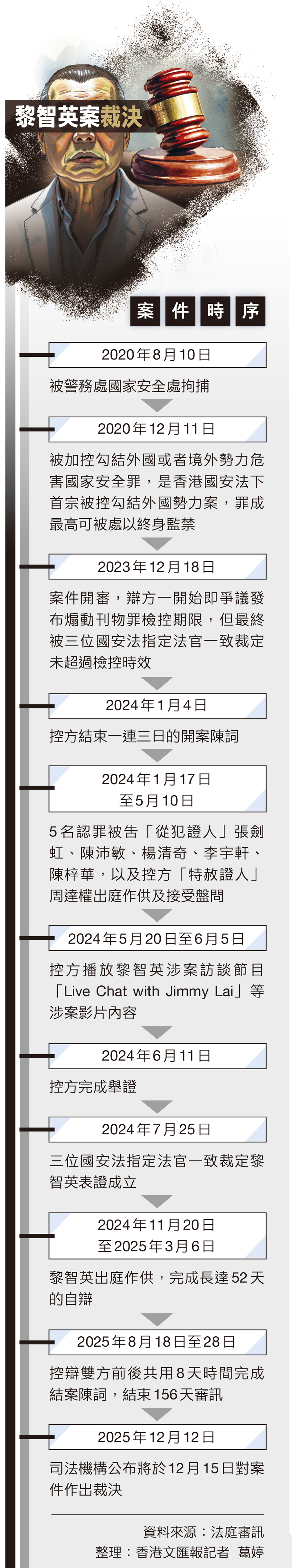 案件於2023年12月開審,去年7月裁定表證成立後,黎智英選擇出庭作供,歷時52日,本年8月控辯雙方完成結案陳詞,今天(15日)在西九龍裁判法院(暫代高等法院)由高院原訟法庭三名國安法指定法官組成的合議庭作出裁決。