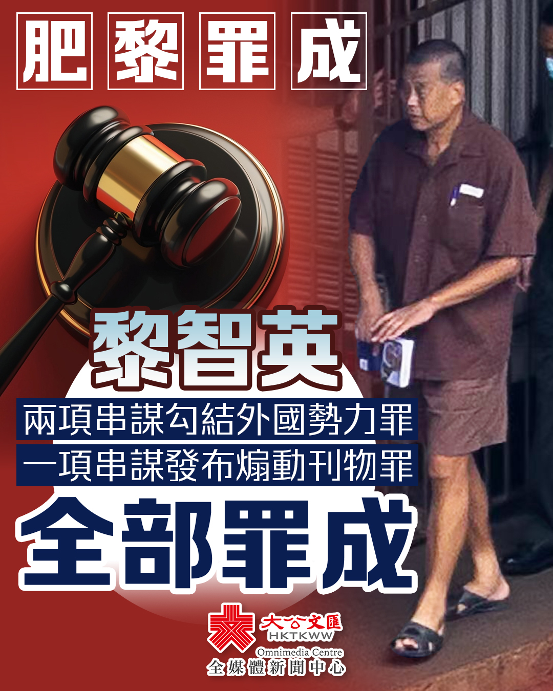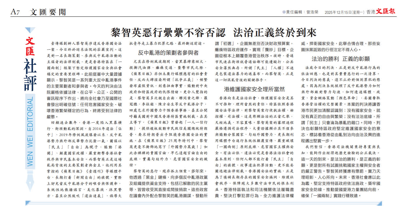 壹傳媒集團創辦人黎智英與蘋果日報系3間公司涉嫌串謀勾結外國勢力案,以及涉嫌串謀他人發布煽動刊物案,審訊歷時156天,今天(15日)在西九龍裁判法院(暫代高等法院)由高院原訟法庭三名國安法指定法官杜麗冰、李素蘭和李運騰組成的合議庭裁決。三名國安法指定法官裁定黎智英2項串謀勾結外國勢力及1項煽動罪名全部成立。香港《文匯報》今日刊發社評文章《黎智英惡行纍纍不容否認 法治正義終於到來》,指出:「今天的判決由法院嚴格依據法律,在公平、公正、公開的審訊程序下作出,將向全社會乃至國際社會發出明確信號:任何危害國家安全、破壞香港繁榮穩定的行為,終將受到法律的嚴懲。」