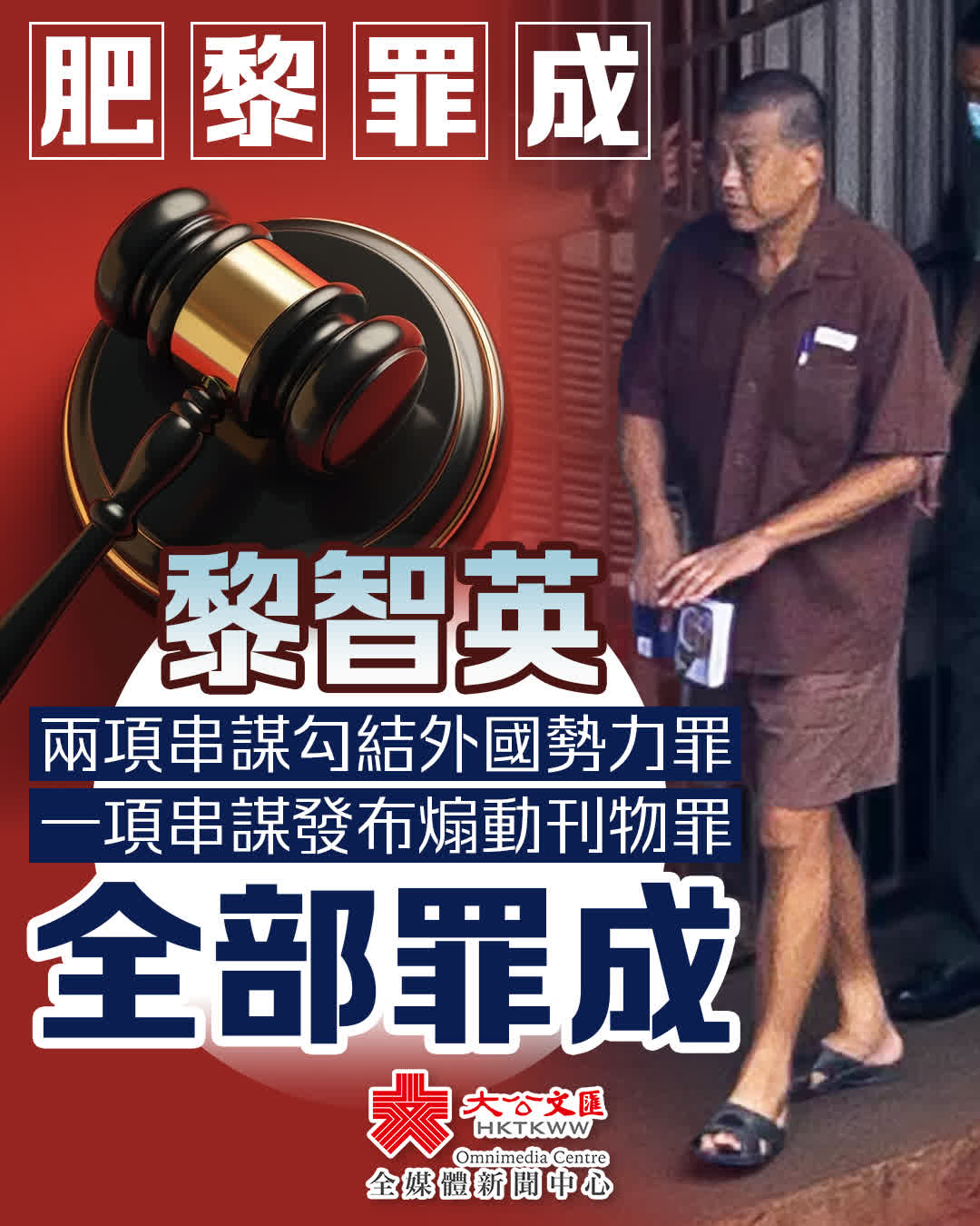 三名國安法指定法官裁定黎智英2項串謀勾結外國勢力及1項煽動罪名全部成立。