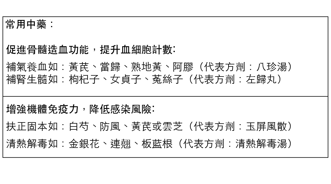 乳腺癌患者在化療和標靶治療期間,可能出現白細胞、血小板減少,貧血等骨髓抑制的情況,影響免疫功能以及影響治療進度。在適當的時候運用適當的中藥,有機會預防或改善有關症狀: