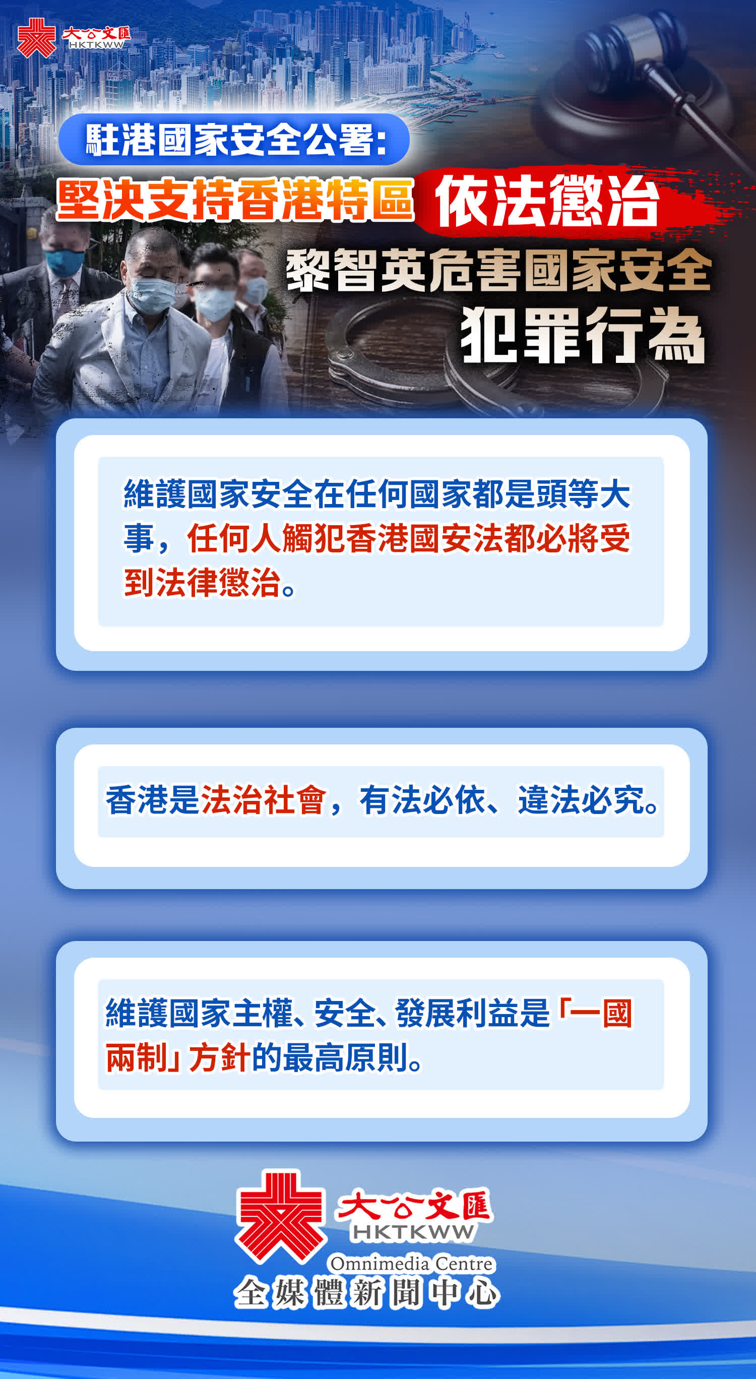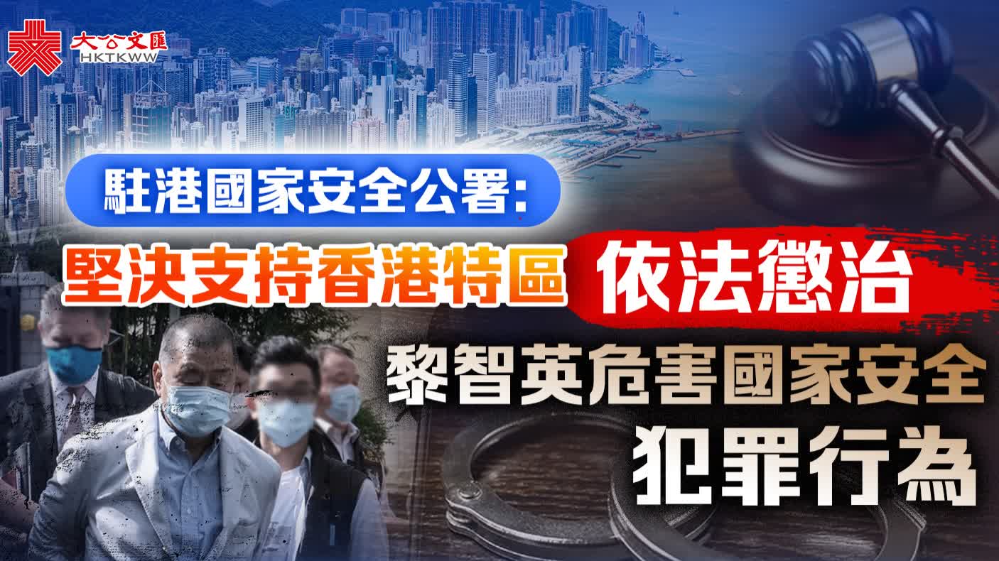 駐港國家安全公署發言人12月15日發表談話表示,堅決支持香港特區司法機構依法裁定黎智英串謀勾結外國或者境外勢力危害國家安全等罪名成立。