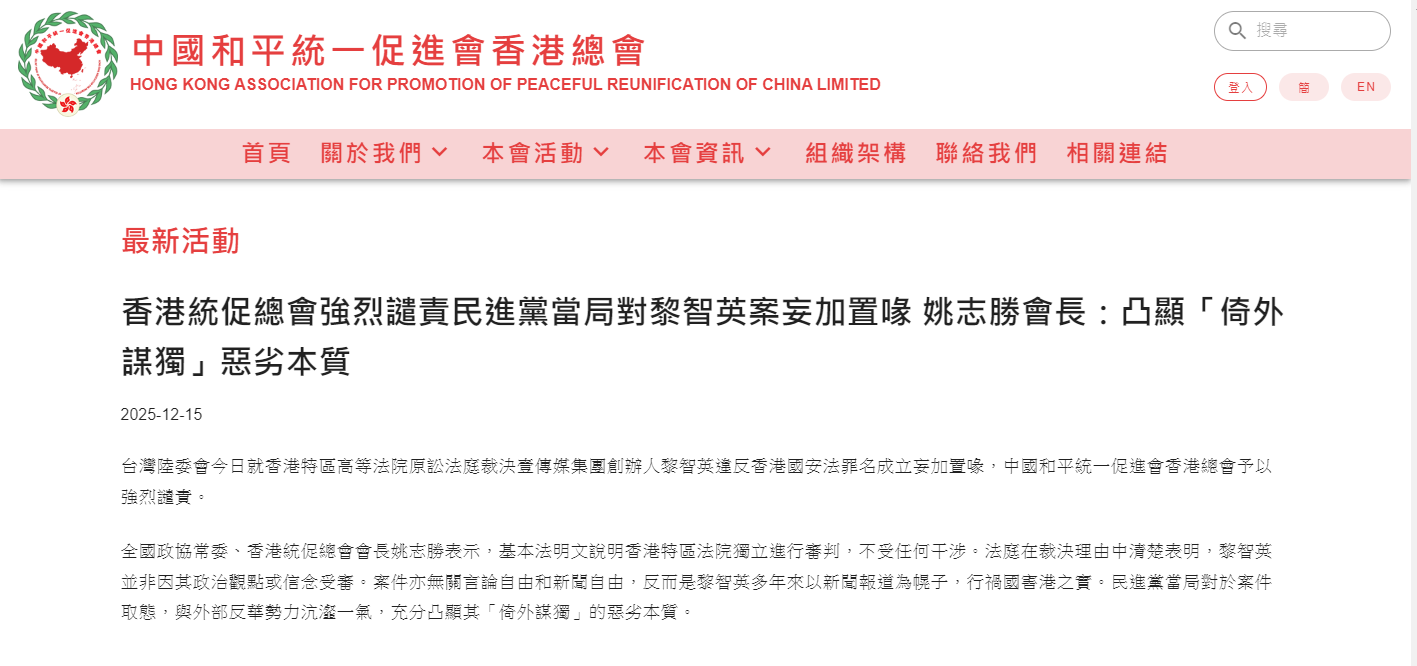 全國政協常委、香港統促總會會長姚志勝表示,基本法明文說明香港特區法院獨立進行審判,不受任何干涉。法庭在裁決理由中清楚表明,黎智英並非因其政治觀點或信念受審。案件亦無關言論自由和新聞自由,反而是黎智英多年來以新聞報道為幌子,行禍國害港之實。民進黨當局對於案件取態,與外部反華勢力沆瀣一氣,充分凸顯其「倚外謀獨」的惡劣本質。