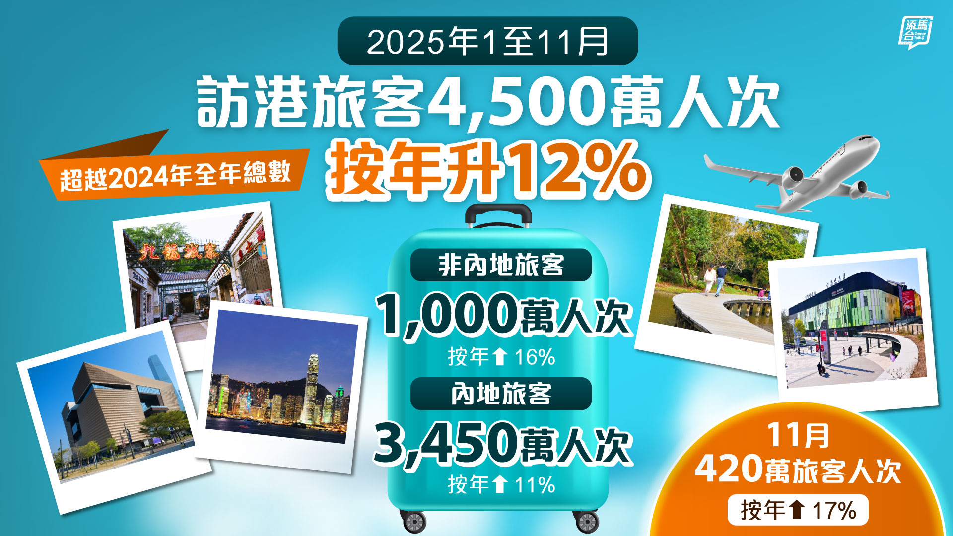 根據香港旅遊發展局最新公布的數字,11月初步訪港旅客為約420萬人次,較去年同期上升17%。累計今年首11個月,共錄得約4,500萬訪港旅客人次,按年增加12%,已超越2024年全年訪港旅客量總數。看圖了解更多。