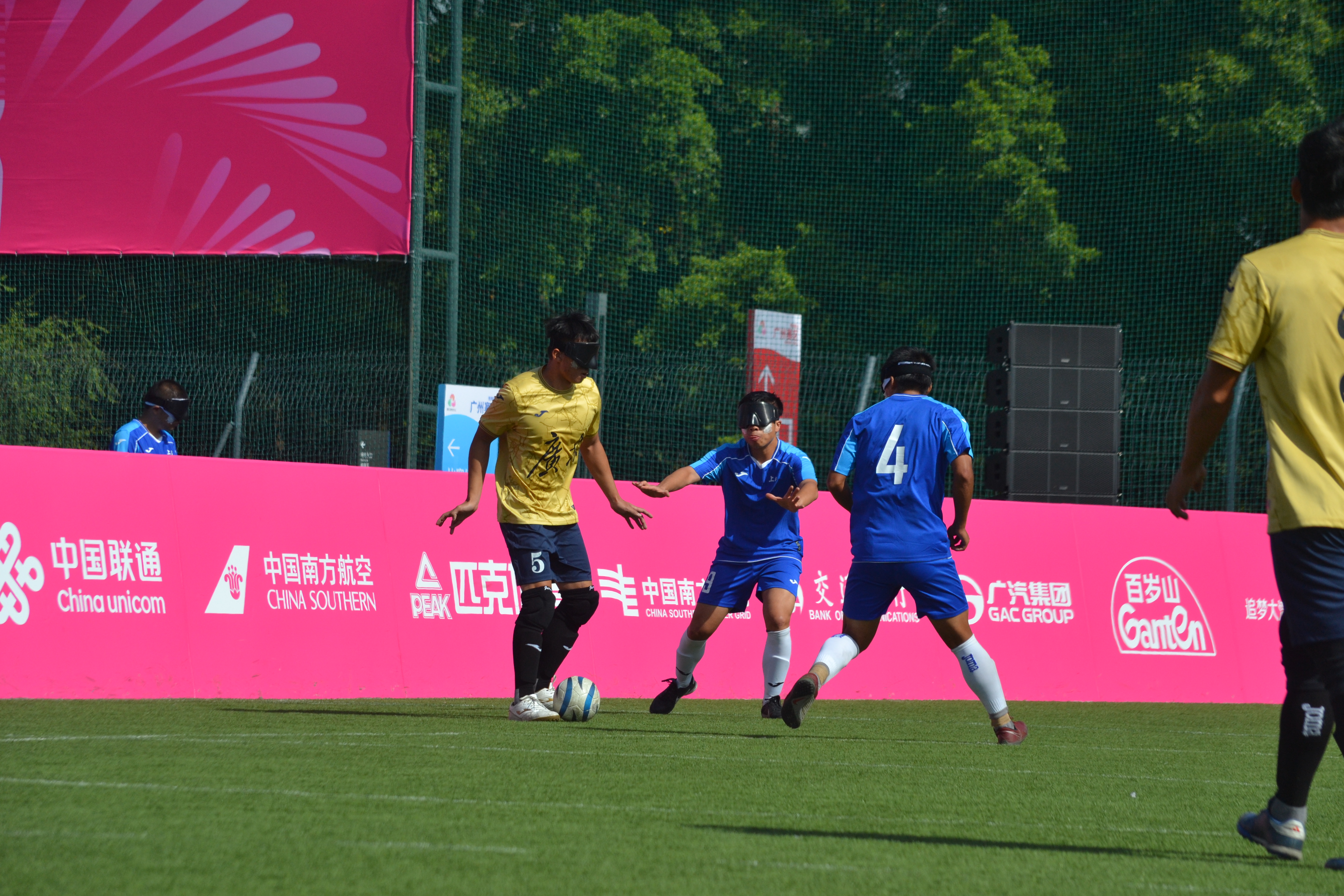 15日,盲人足球男子組最後一場比賽舉行,將決定最後金牌歸屬。記者在現場看到,和普通足球賽相比,各隊均在場地不同方位有多名教練組成員,不斷吶喊,用聲音給球員判別方向走位。守門員則是健全人士,亦是現場最忙碌的球員,不斷用聲音給隊友跑位助力。