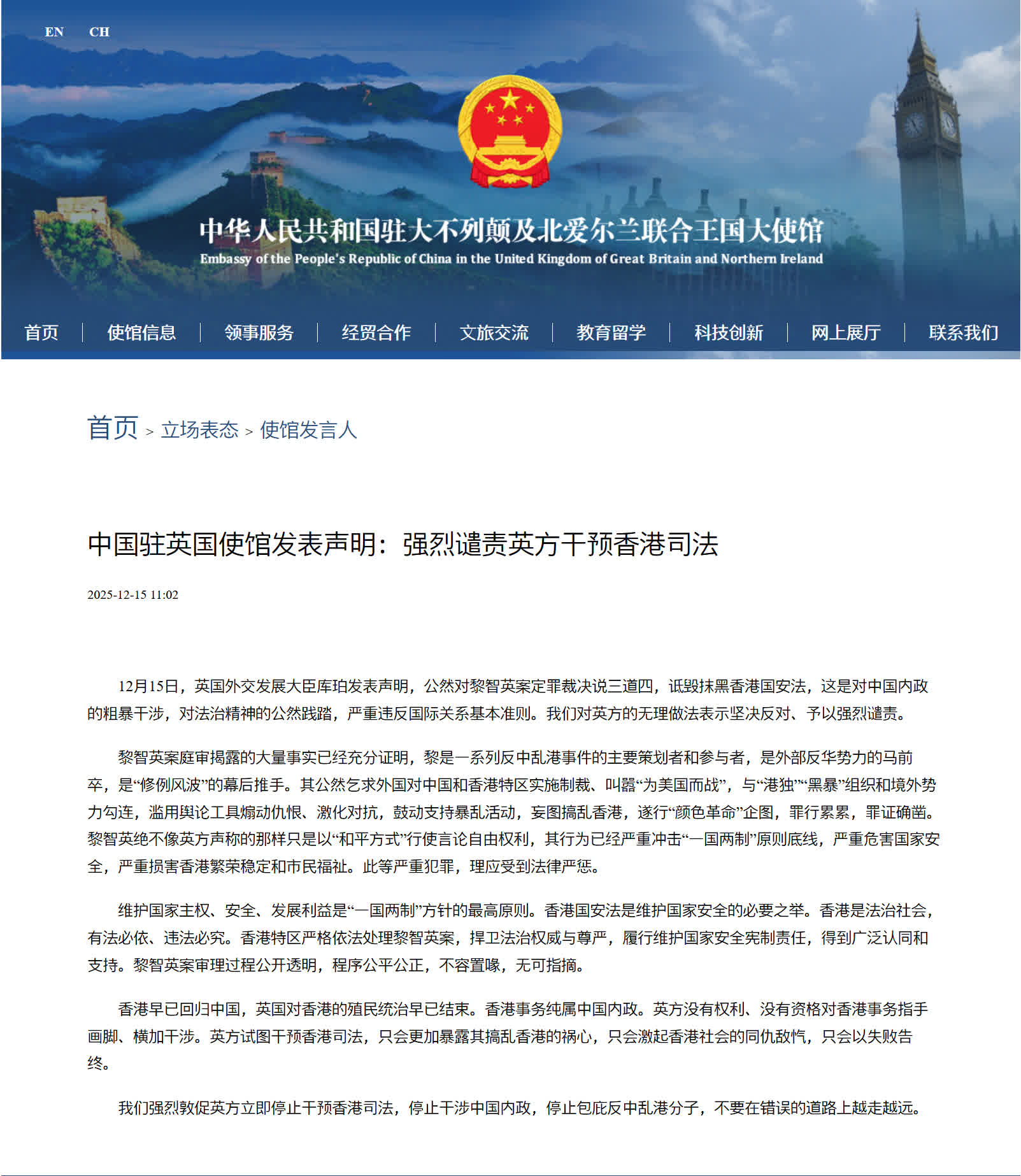 駐英國使館指出,維護國家主權、安全、發展利益是「一國兩制」方針的最高原則。香港國安法是維護國家安全的必要之舉。香港是法治社會,有法必依、違法必究。香港特區嚴格依法處理黎智英案,捍衛法治權威與尊嚴,履行維護國家安全憲制責任,得到廣泛認同和支持。黎智英案審理過程公開透明,程序公平公正,不容置喙,無可指摘。