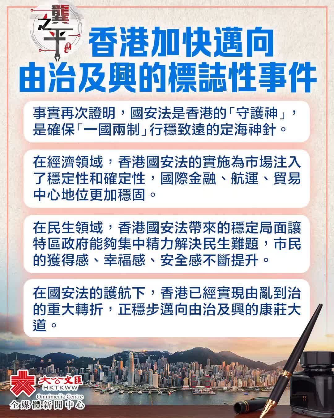 黎智英案的公正審判,是香港國安法實施成效的最佳寫照,是「一國兩制」實踐的重要勝利,向世界發出堅定維護國安的清晰信號。5年多來的實踐充分證明,香港國安法是維護國家主權、安全、發展利益的好法律,是保持香港長期繁榮穩定的好法律,是確保香港市民福祉和各國投資者利益的好法律。在國安法的護航下,香港已經實現由亂到治的重大轉折,正穩步邁向由治及興的康莊大道。那個曾經被暴力陰霾籠罩的香港已經遠去,一個安全、穩定、繁榮、充滿希望的香港正在大步向前邁進。