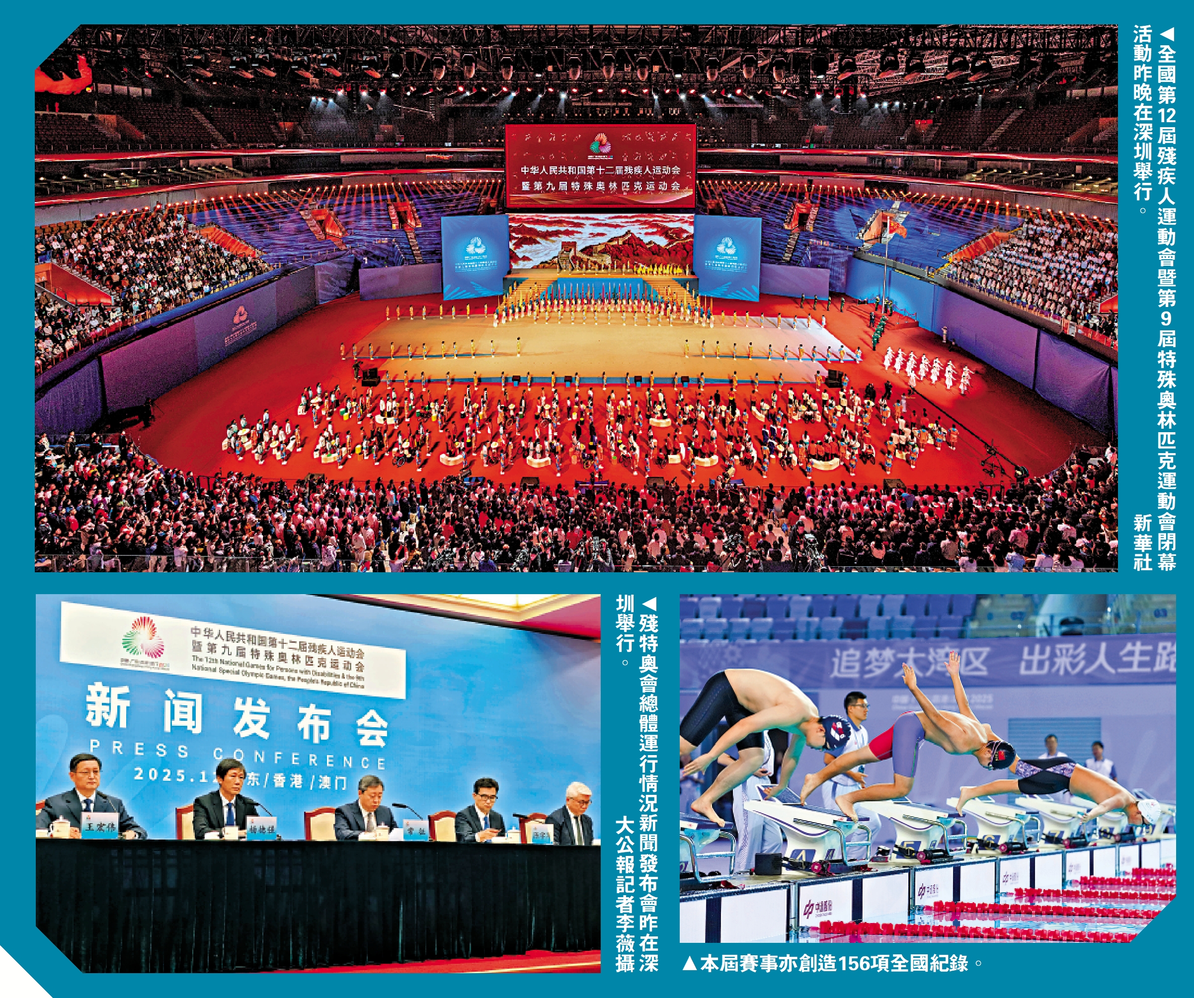 大公報據新華社報道:中華人民共和國第12屆殘疾人運動會暨第9屆特殊奧林匹克運動會15日晚在深圳閉幕,這是粵港澳三地首次聯合承辦全國殘特奧會,充分體現了以習近平同志為核心的黨中央對殘疾人事業的高度重視、對殘疾人的格外關心。15日下午,殘特奧會總體運行情況新聞發布會在深圳舉行,詳細通報了賽事整體成效,本屆賽事創造了超15項世界紀錄和156項全國紀錄。