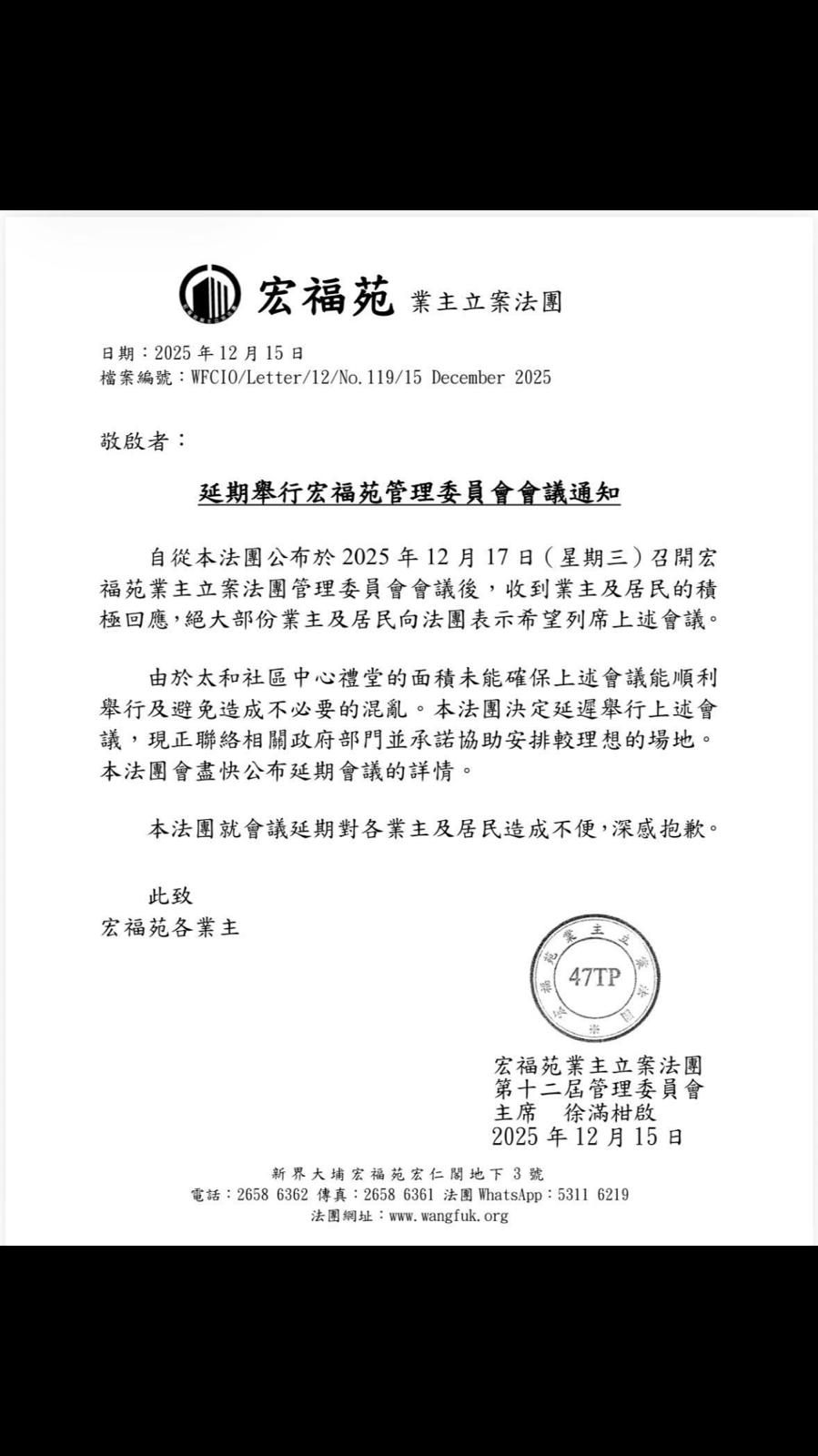 大公文匯全媒體報道,造成嚴重傷亡的大埔宏福苑五級大火已過去近3星期。宏福苑業主立案法團原定明(17日)晚7時半在太和社區中心禮堂舉行全體委員會議。然而,法團昨日(15日)發通告表示,因為收到業主及居民反映,指絕大部分業主及居民希望列席參與會議,但由於禮堂面積有限,未能確保會議能順利舉行及避免混亂,法團決定延遲舉行會議並安排較理想場地,詳情有待稍後公布。