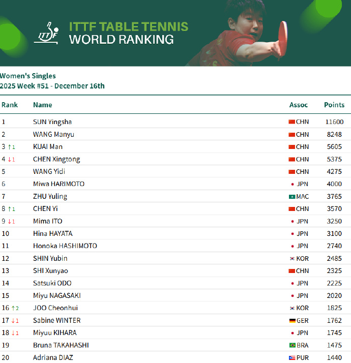 大公文匯全媒體報道,北京時間12月16日,國際乒聯公布2025年第51周世界排名,孫穎莎連續179周位居女單第1,王楚欽依然位列男單榜首,蒯曼升至女單世界第3。