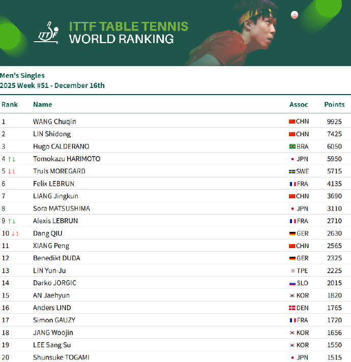 混雙方面,林詩棟/蒯曼位列榜首,王楚欽/孫穎莎第3,黃友政/陳熠第11。