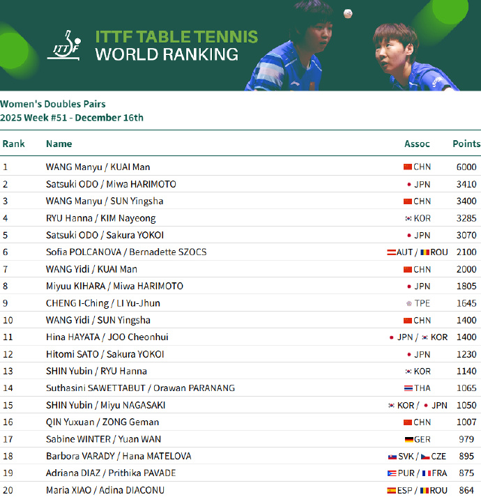 女雙方面,王曼昱/蒯曼排名第1,孫穎莎/王曼昱第3,蒯曼/王藝迪第7,孫穎莎/王藝迪第10。