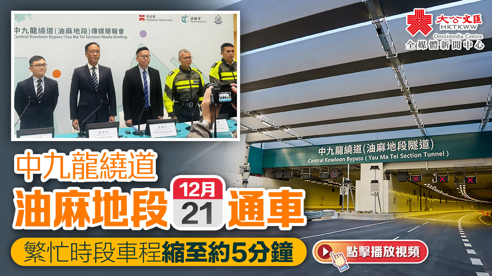 (大公文匯全媒體 記者 周傾芫)路政署、運輸署及警務處代表今日(16日)舉行記者會,公布中九龍繞道(油麻地段)將於本周日(21日)上午10時正式通車。屆時,由油麻地前往九龍灣的車程,於繁忙時間將由現時約30分鐘大幅縮短至約5分鐘,顯著提升九龍區的東西行交通效率。