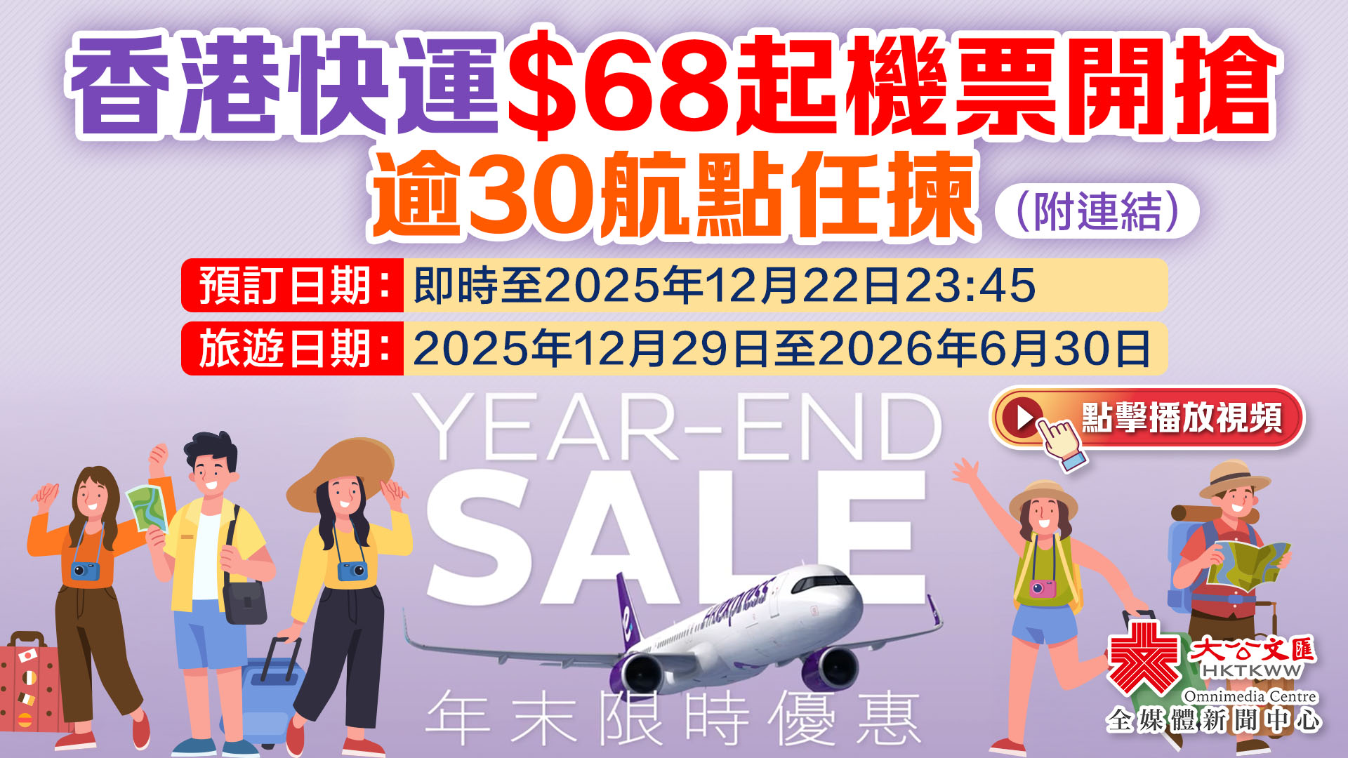 大公文匯全媒體報道,香港快運航空(HK Express)今日(16日)推出年末限時優惠,全線航點「輕便飛」單程票價低至68元起,當中港人最愛的日本航點更佔11個,旅遊日期可至2026年6月底。