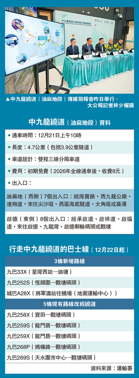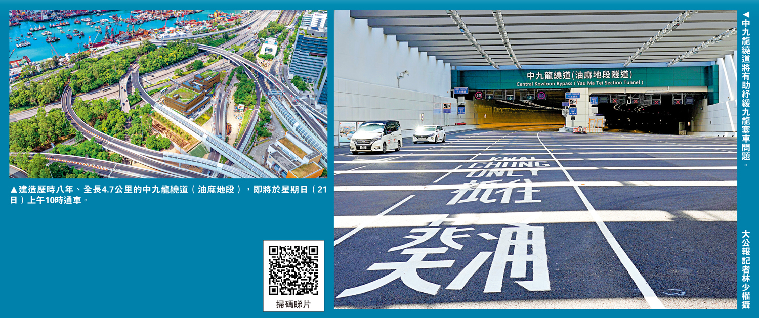 (大公報 記者 王亞毛)建造歷時八年、全長4.7公里的中九龍繞道(油麻地段),即將於星期日(21日)上午10時通車。大公報記者昨日率先體驗,乘車穿過3.9公里長的隧道只需5至6分鐘,便由油麻地抵達九龍灣。