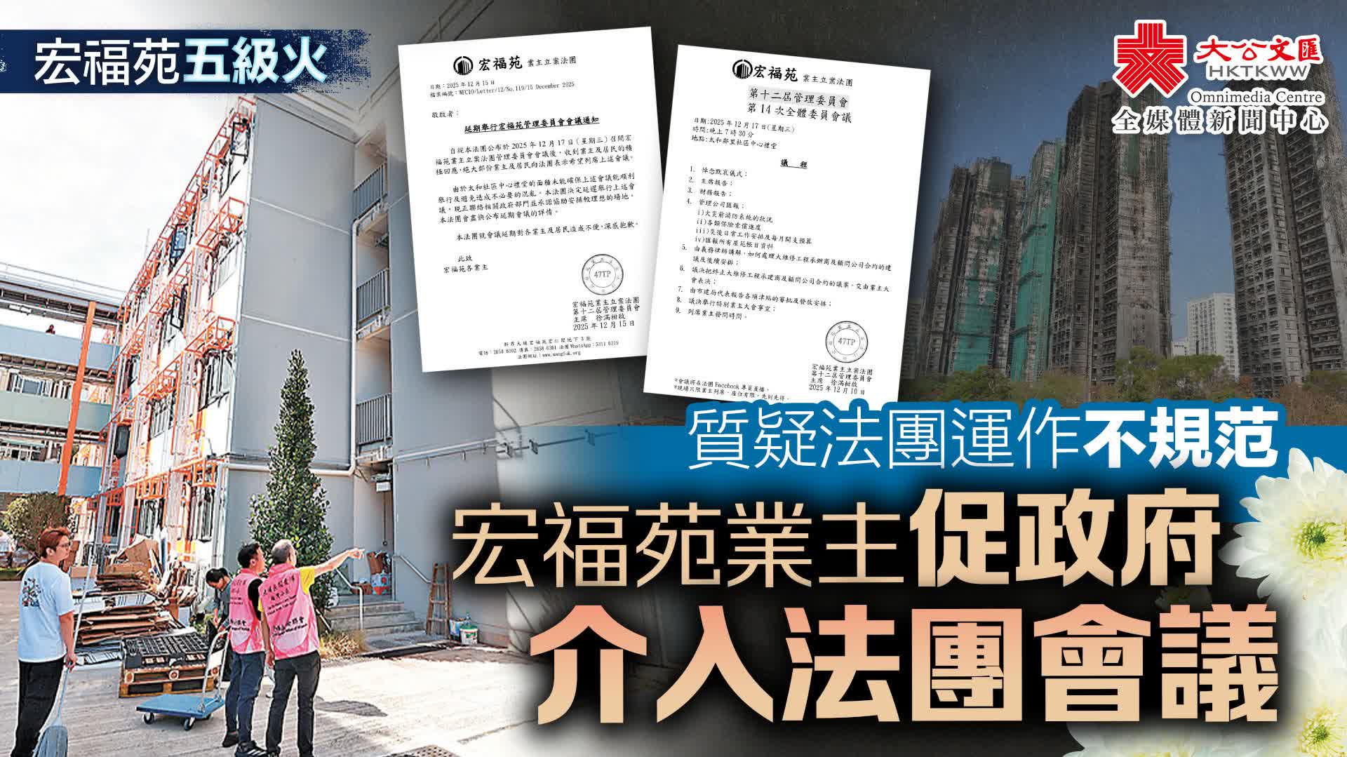 (香港文匯報 記者 張茗)大埔宏福苑近2,000戶的家園被大火摧毀,業主立案法團原定今日(17日)召開立案法團管理委員會會議,但因場地問題引發居民不滿而宣布延期。有業主家屬接受香港文匯報訪問時指出,法團會議議程包括議決將終止大維修工程承辦商和顧問公司合約,交由業主大會表決等,業主們質疑有關議程偏離重點。他指出一眾業主面對家園受損,目前首要是處理安置負擔加重等問題,而非表決工程相關議程,促請特區政府介入以釐清責任,並規範法團運作,以防法團動用業主資金,保障業主們的合法權益。