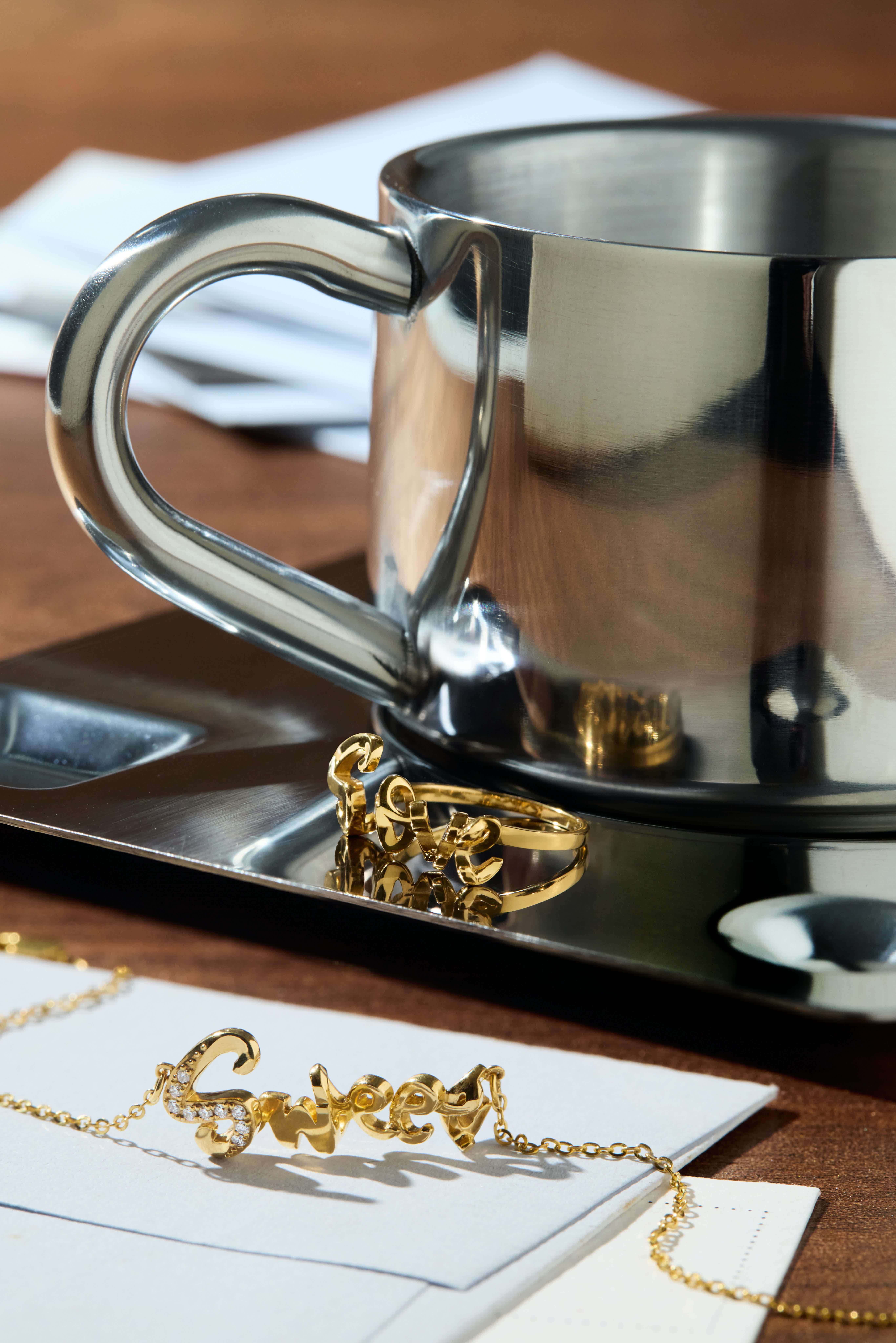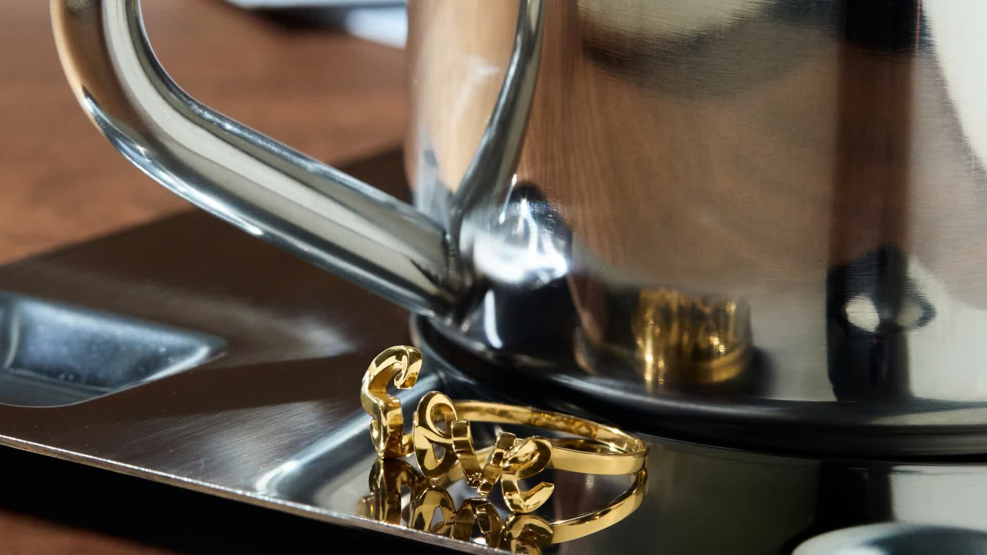 「密語」系列以999金匠心鑄造,每件作品完美呈現金工的精緻細節,飾以璀璨的密鑲鑽石作點綴,盡顯奢華質感與經典現代美學。工匠大師以黃金鐫刻細膩的文字和數字圖案,更透過「錯視透視」工藝,將另一組文字巧妙隱藏於結構之中。首款設計正面展示「Sweet」字樣,側轉間呈現「Love」隱藏訊息,將甜蜜告白化為永恒瞬間。此款式提供頸鍊、耳環、手鍊及戒指選擇,可自由疊戴打造層次時尚感,讓每個佩戴瞬間都流露雙重浪漫意涵。
