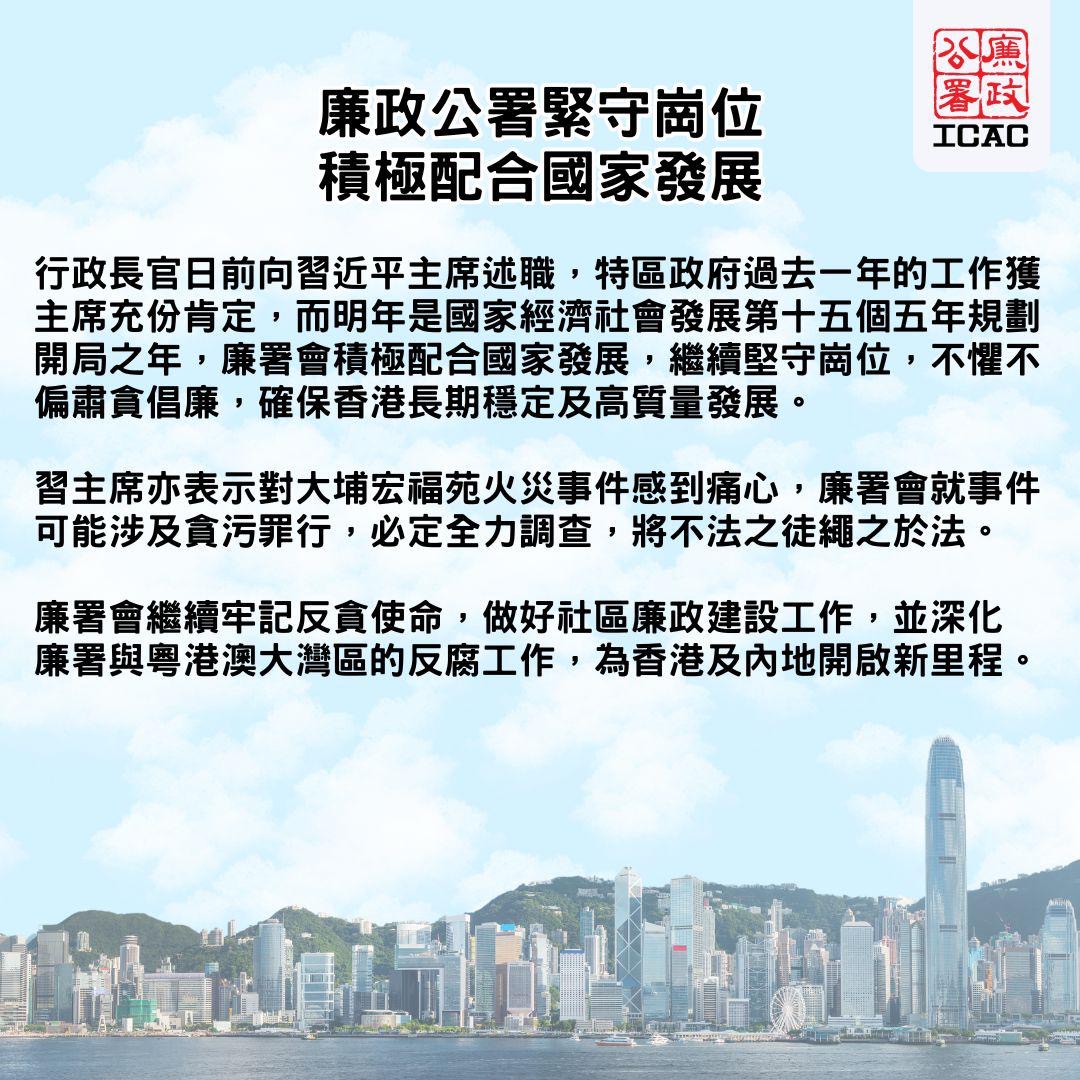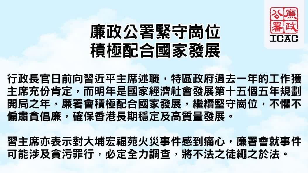 行政長官日前向習近平主席述職,特區政府過去一年的工作獲主席充分肯定,而明年是國家經濟社會發展第十五個五年規劃(「十五五」規劃)開局之年,廉署會積極配合國家發展,繼續堅守崗位,不懼不偏肅貪倡廉,確保香港長期穩定及高質量發展。