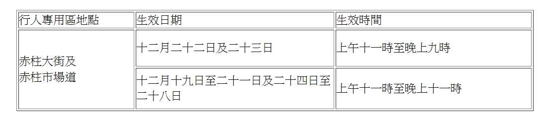 - 赤柱大街和赤柱市場道將於以下日期及時間實施行人專用區: