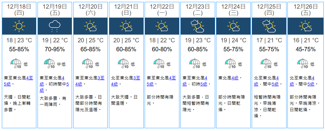 不過,天文台預料東北季候風補充會在下周初至中期影響廣東,該區早上稍涼。根據天文台最新九天天氣預報,下周三(12月24日)平安夜不太冷,部分時間有陽光,日間乾燥,市區最高氣溫可達24度;惟下周四(12月25日)聖誕日一夜轉涼,短暫時間有陽光,市區最低17度,早晚清涼,日間乾燥;到下周五(12月26日)Boxing Day更低見16度,部分時間有陽光,早晚清涼,日間乾燥。