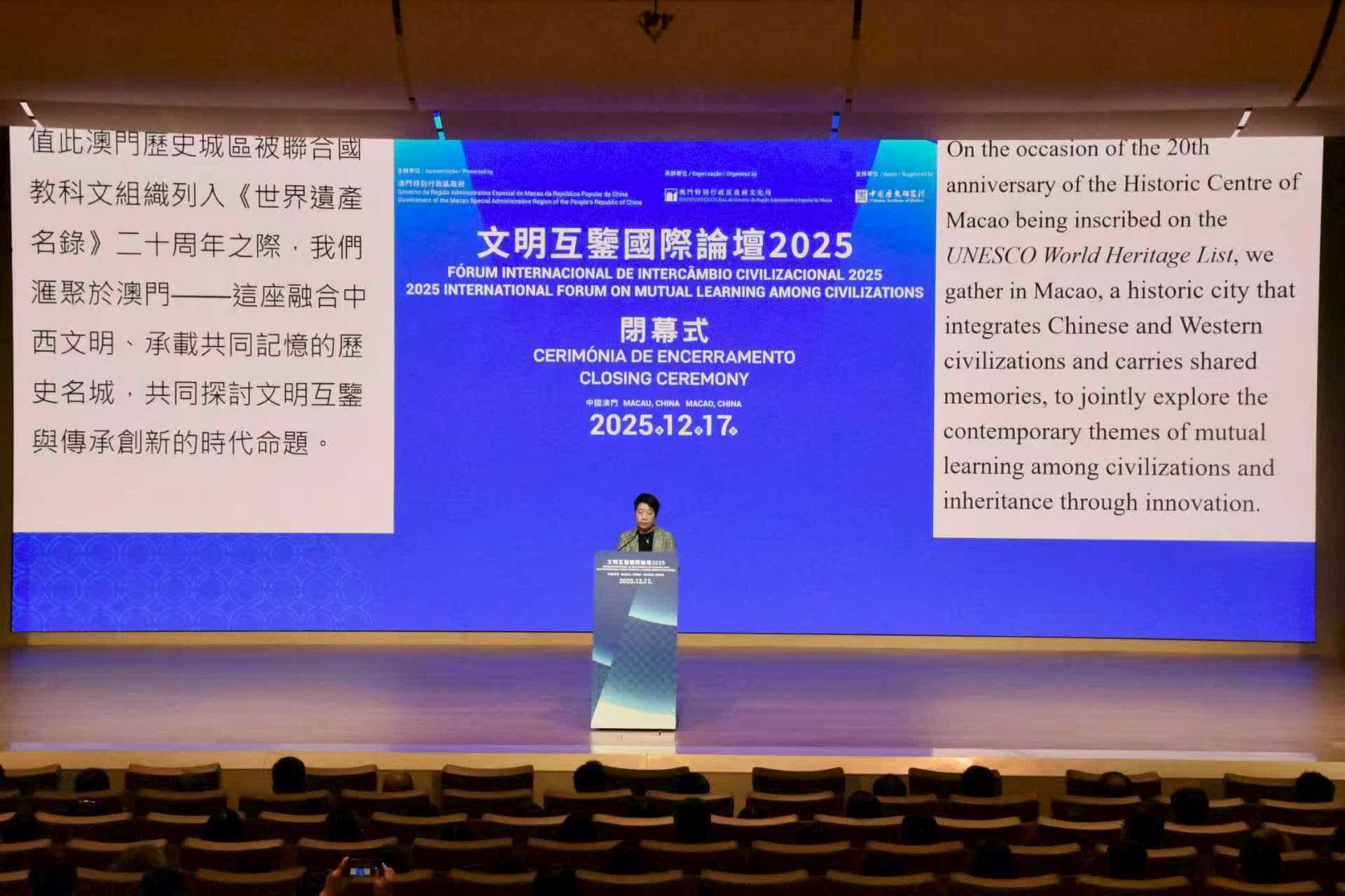 大公文匯網報道,由澳門特別行政區政府主辦,文化局承辦,中國社會科學院中國歷史研究院支持的「文明互鑒國際論壇2025」今(17)日舉行閉幕儀式,澳門社會文化司司長柯嵐、中聯辦副主任黃柳權等出席。澳門文化局局長梁惠敏致詞表示,依託「一國兩制」優勢,澳門正努力建設國家高水平對外開放的重要橋頭堡和中西文明交流互鑒的重要窗口,而論壇的豐碩成果,將為中華文明與世界多元文明的對話貢獻澳門力量。