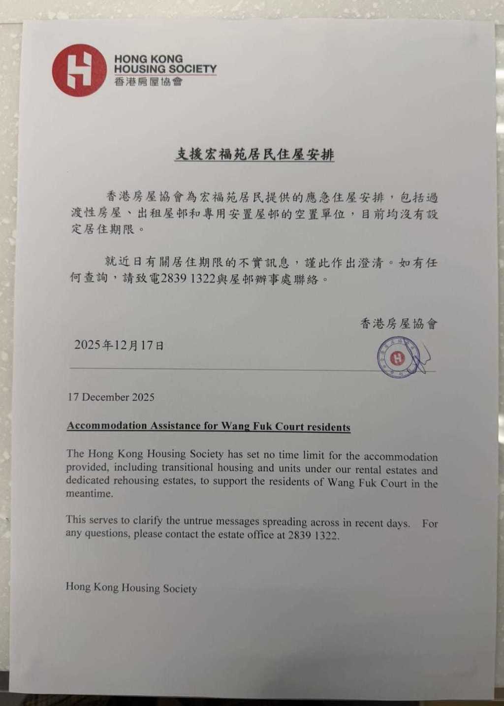 公告指,香港房屋協會為宏福苑居民提供的應急住屋安排,包括過渡性房屋、出租屋邨和專用安置屋邨的空置單位,目前均沒有設定居住期限。公告特別強調,房協就近日有關居住期限的不實訊息作出澄清,並提醒居民若有任何查詢,可與所入住的屋邨辦事處聯絡。