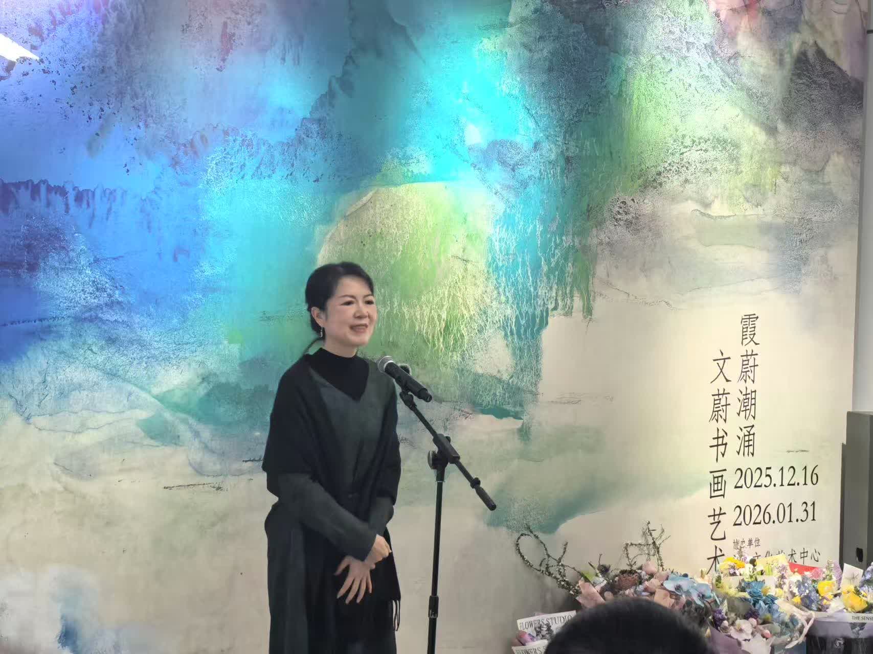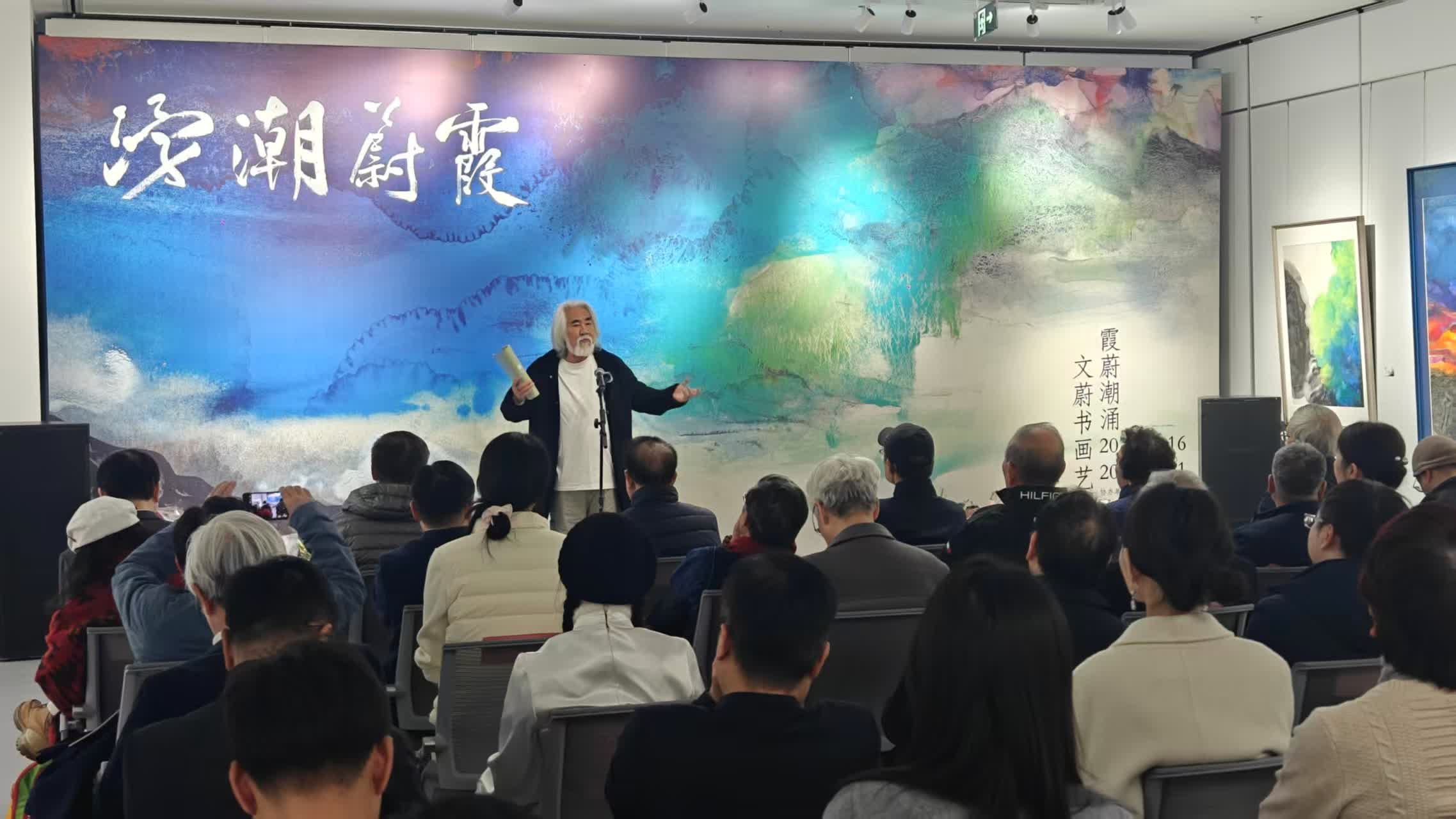 16日,「霞蔚潮湧:文蔚書畫藝術展」於浙江杭州潮π文化藝術中心開幕。本次展覽匯聚了當代藝術家文蔚近年來的精心力作,涵蓋其獨具特色的「天地玄黃」系列小品及氣勢恢宏的潑彩潑墨山水,旨在引領觀眾踏上一場從微觀芥子通往浩瀚須彌的精神旅程。