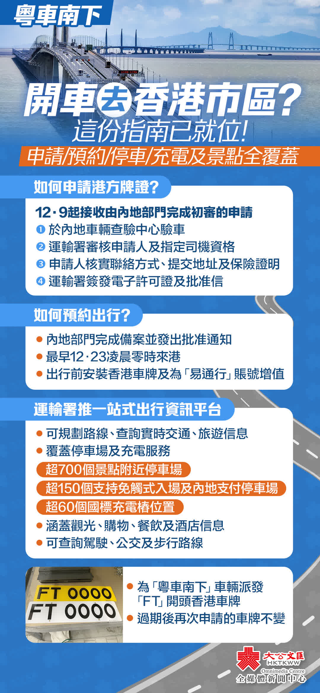 運輸署發言人表示,「粵車南下」(入境市區部分)由12月9日起接受合資格廣東私家車申請。經署方審批後,申請人陸續完成驗車、核實「電子聯絡方式」及購買保險等程序,並在申請平台提交文件。署方將陸續向獲批申請人發出電子許可證和批准信。獲批並成功預約出行的粵車,可由12月23日凌晨零時起經港珠澳大橋入境香港市區,每次留港最多3日。