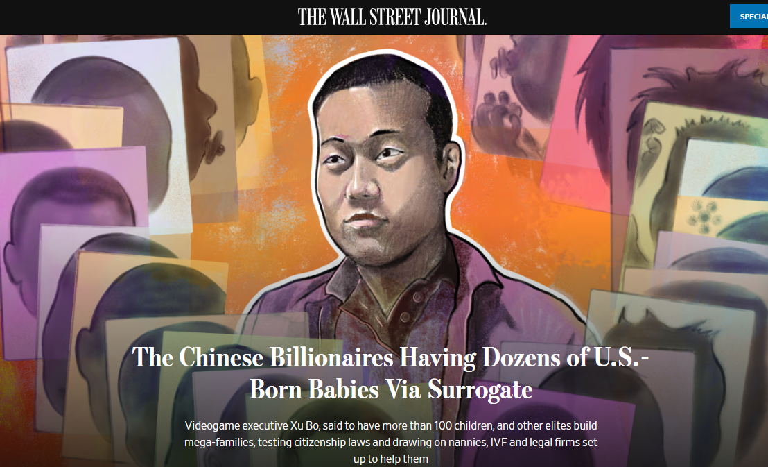 《華爾街日報》在其調查報道中指,中國電腦遊戲大亨、網絡遊戲公司多益網絡董事長徐波(Xu Bo)等中國億萬富豪透過代理孕母在美國生下數十名、甚至更多嬰兒,目標是建立人數龐大的「超級家庭」。然而,其遊走於法律邊緣的手段挑戰了美國民法規定,也讓協助完成代孕計劃的保姆、試管嬰兒(IVF)機構以及律師事務所受到檢視。