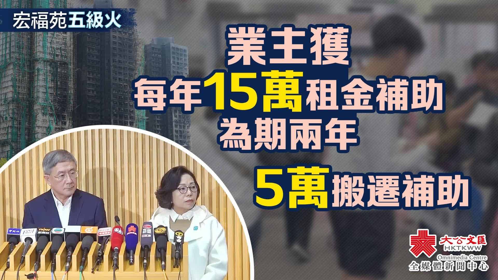 麥美娟表示,政府將給宏福苑居民提供租金補助和搬遷補助,受災居民每年可獲發15萬元租金補助,為期兩年,半年發放一次,即7.5萬元。另外,政府亦會提供5萬元的一次性搬遷補助。