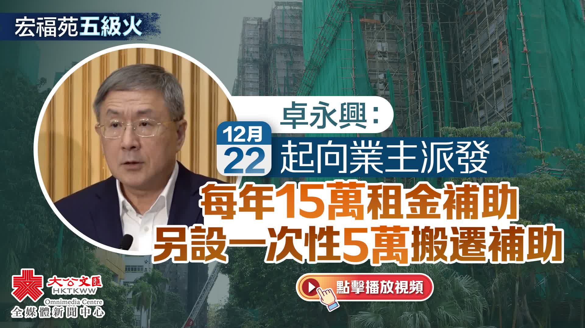 卓永興介紹目前受影響居民所住地,指出提供資金補助讓居民自行選擇居住屬於最可行解決方法。他表示,將從12月22日開始向宏福苑業主提供每年15萬元的租金補助,以及一次性5萬元搬遷補助;向受影響的租戶發放一次性5萬元的搬遷補助。