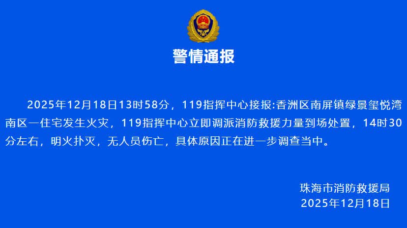 大公文匯網報道,珠海市消防救援局發布警情通報:2025年12月18日13時58分,119指揮中心接報稱,香洲區南屏鎮綠景璽悅灣南區一住宅發生火災,119指揮中心立即調派消防救援力量到場處置,14時30分左右,明火撲滅,無人員傷亡,具體原因正在進一步調查當中。