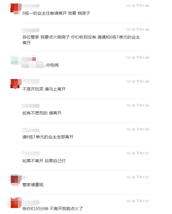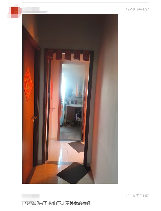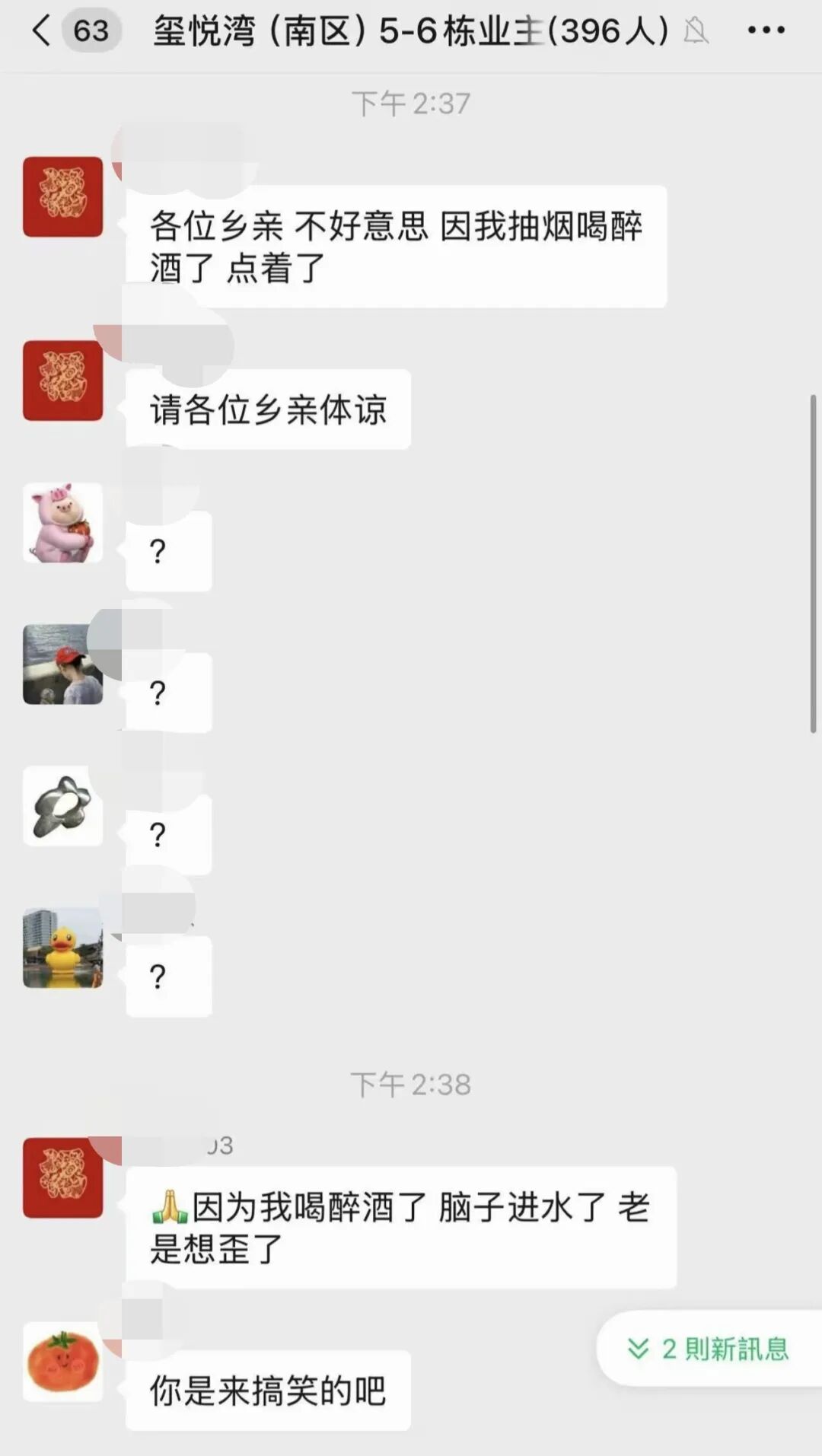 此前據新黃河報道,12月18日,有網民在網絡平台發布聊天截圖,稱廣東省珠海市香洲區一小區業主在業主群內發布點火預告,警告其他業主快速逃離,隨後點燃自家房屋,造成明火。之後,該業主又在群內表示,是自己抽煙喝酒喝醉點着的,並向其他業主道歉。