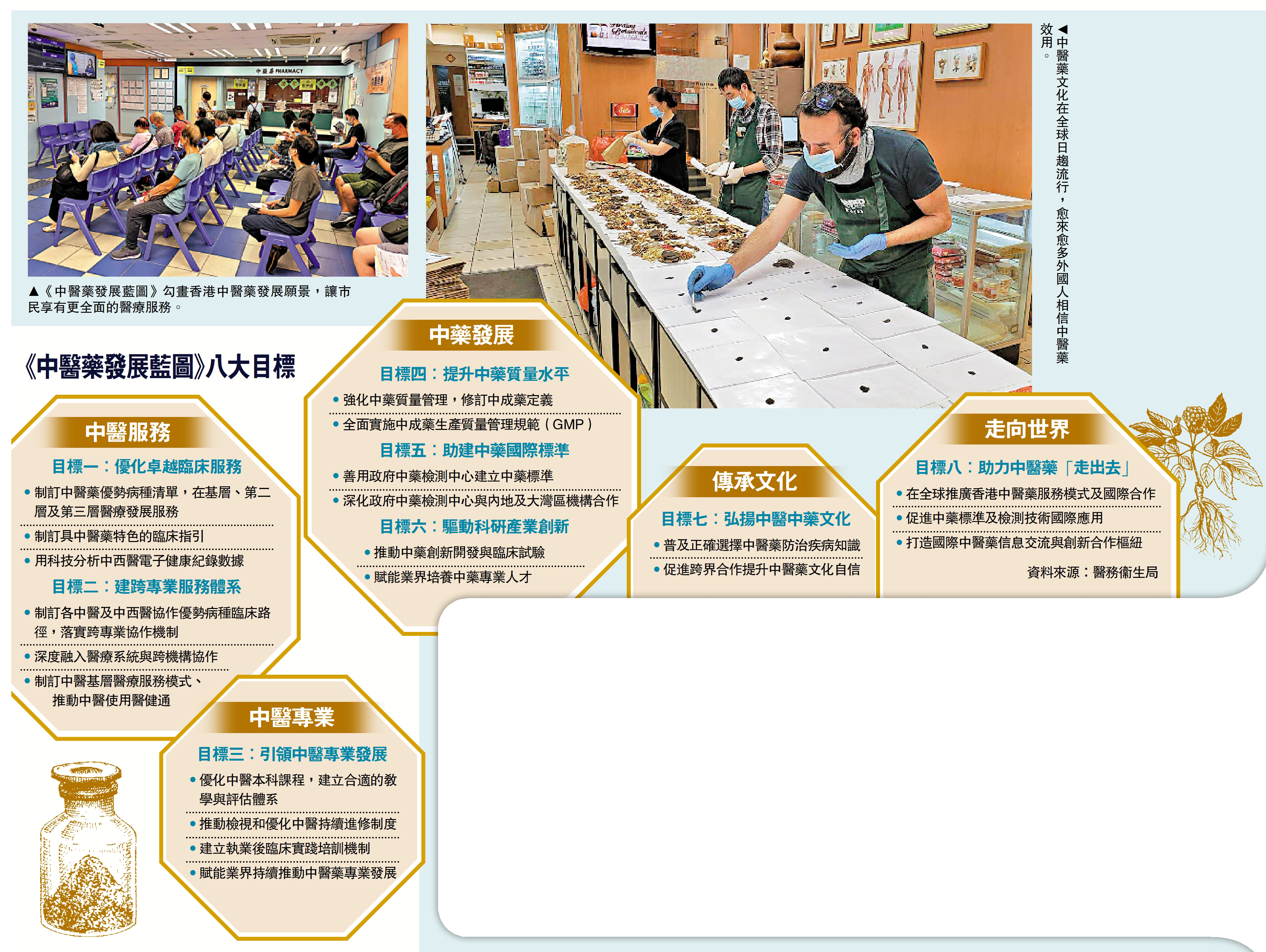 (大公報 記者 王亞毛)特區政府大力推動中醫藥發展,昨日公布本港首份《中醫藥發展藍圖》,涵蓋五大領域,並提出八個目標和20項行動,包括優化中醫藥臨床服務、加強中醫藥在基層醫療的角色等,並推動提供更優質、更全面的中醫醫療服務。醫務衞生局局長盧寵茂表示,希望建設香港成為中醫和中藥走向世界的橋頭堡。
